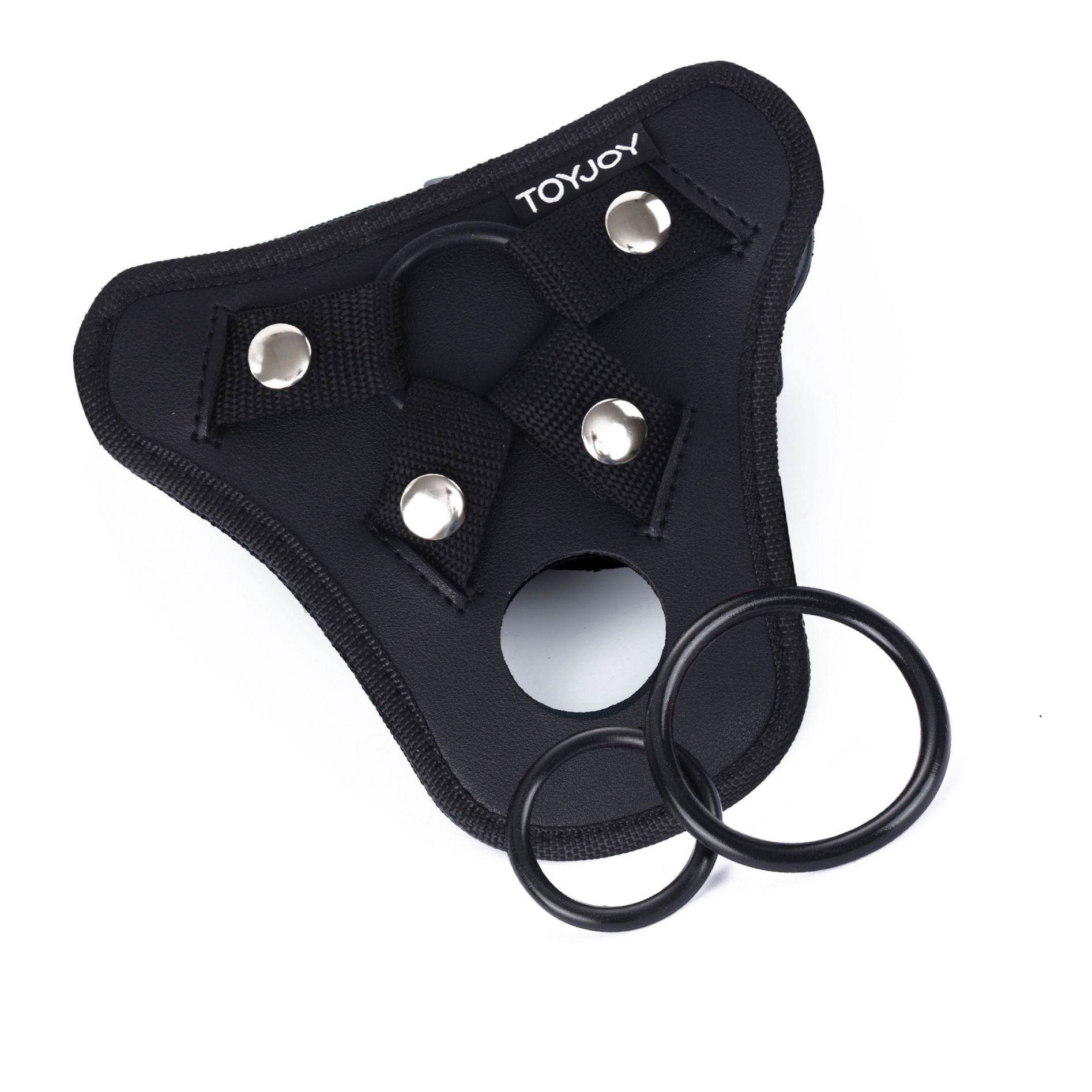 Ham Strap-On TOYJOY, negru, cu pernă frontală căptușită și curele reglabile. Include 3 inele din silicon (Ø 3.5, 4.5, 5 cm) și buzunar pentru vibrator mic (neinclus). Fixare sigură și confort adaptat pentru cuplu.
