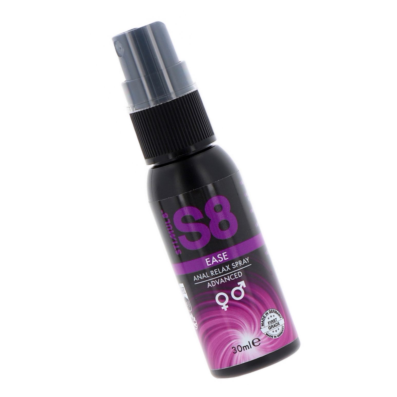 Spray relaxant anal Stimul8 S8 Ease 30 ml cu Laureth-9 pentru desensibilizare ușoară a zonei. 1–2 pulverizări, așteaptă câteva momente. Poate fi folosit cu lubrifiant. Sigur pentru corp.