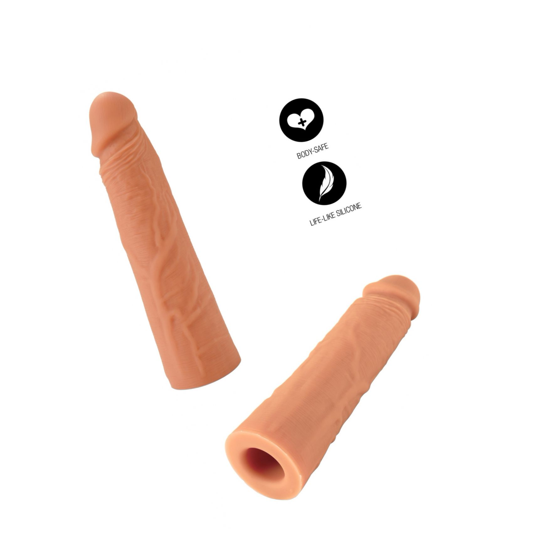 Manșon din silicon lichid, conceput pentru a adăuga volum discret și o senzație apropiată de piele. Venele sculptate și capul definit confereă un aspect natural, iar suprafața delicată este plăcută la atingere.