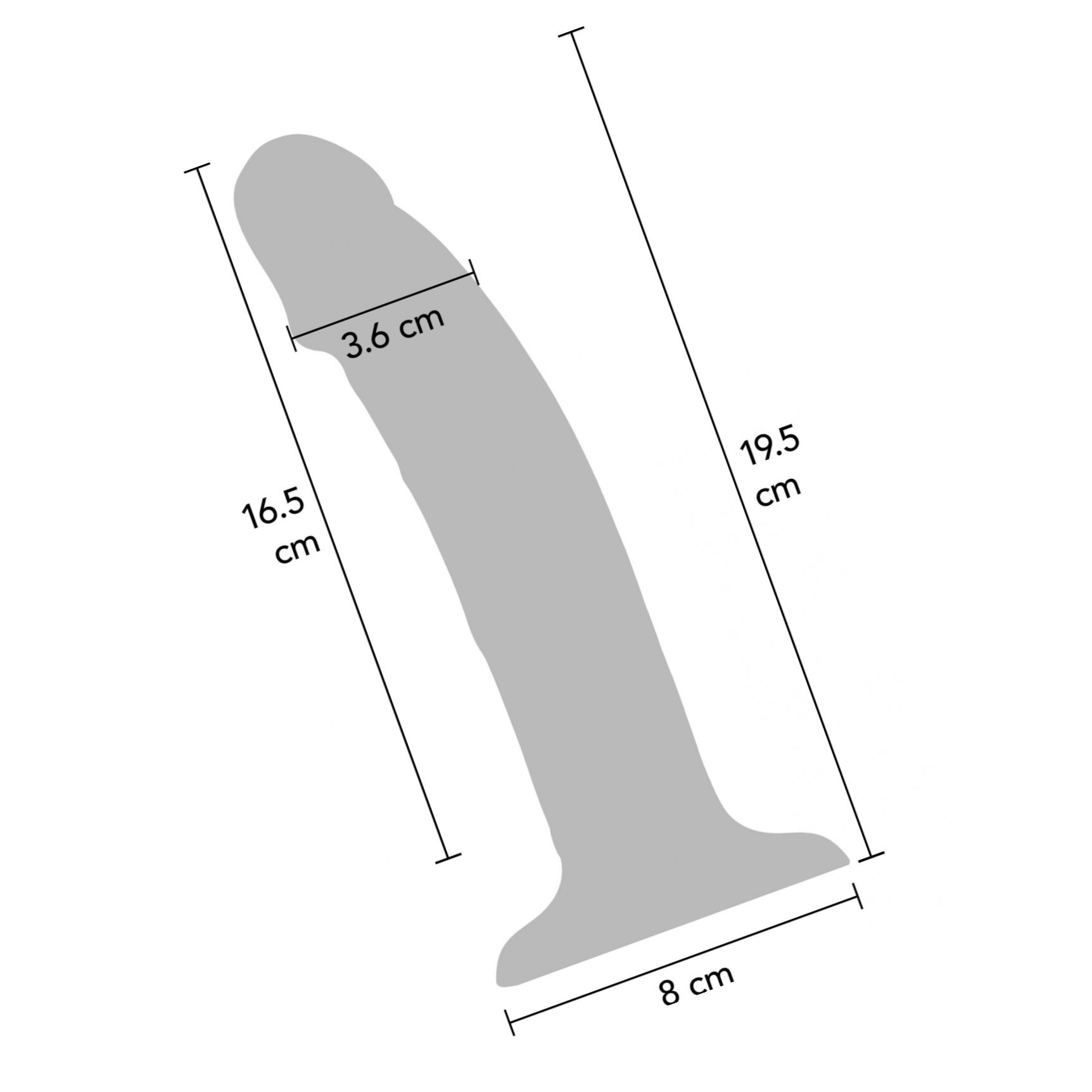 Vibratorul tip dong, creat din silicon 100% sigur pentru corp, oferă o construcţie solidă şi finisaje fine pentru utilizare discretă. Lungimea totală de 19,5 cm și diametrul de 3,6 cm aduce senzaţii stabile și controlate.
