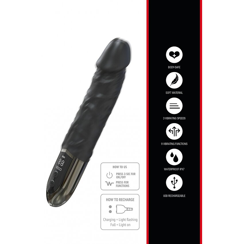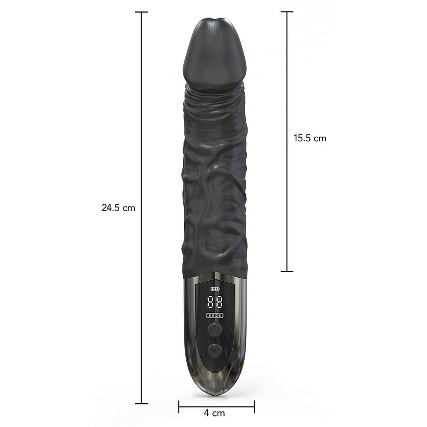 Beneficii și atribute: - Silicon moale, plăcut la mângâiere și hipoalergenic - Lungime totală 24.5 cm, 15.5 cm inserabili pentru control precis - Calibru 3.9 cm pentru stimulare constantă - Mai multe moduri de vibrație și trepte de viteză pentru adaptare la preferințe - Reîncărcabil cu acumulator Li‑Ion; încărcare prin USB, utilizare discretă - Ecran de control pentru monitorizarea vitezei - Tenace la apă pentru spălare accesibilă și utilizare flexibilă