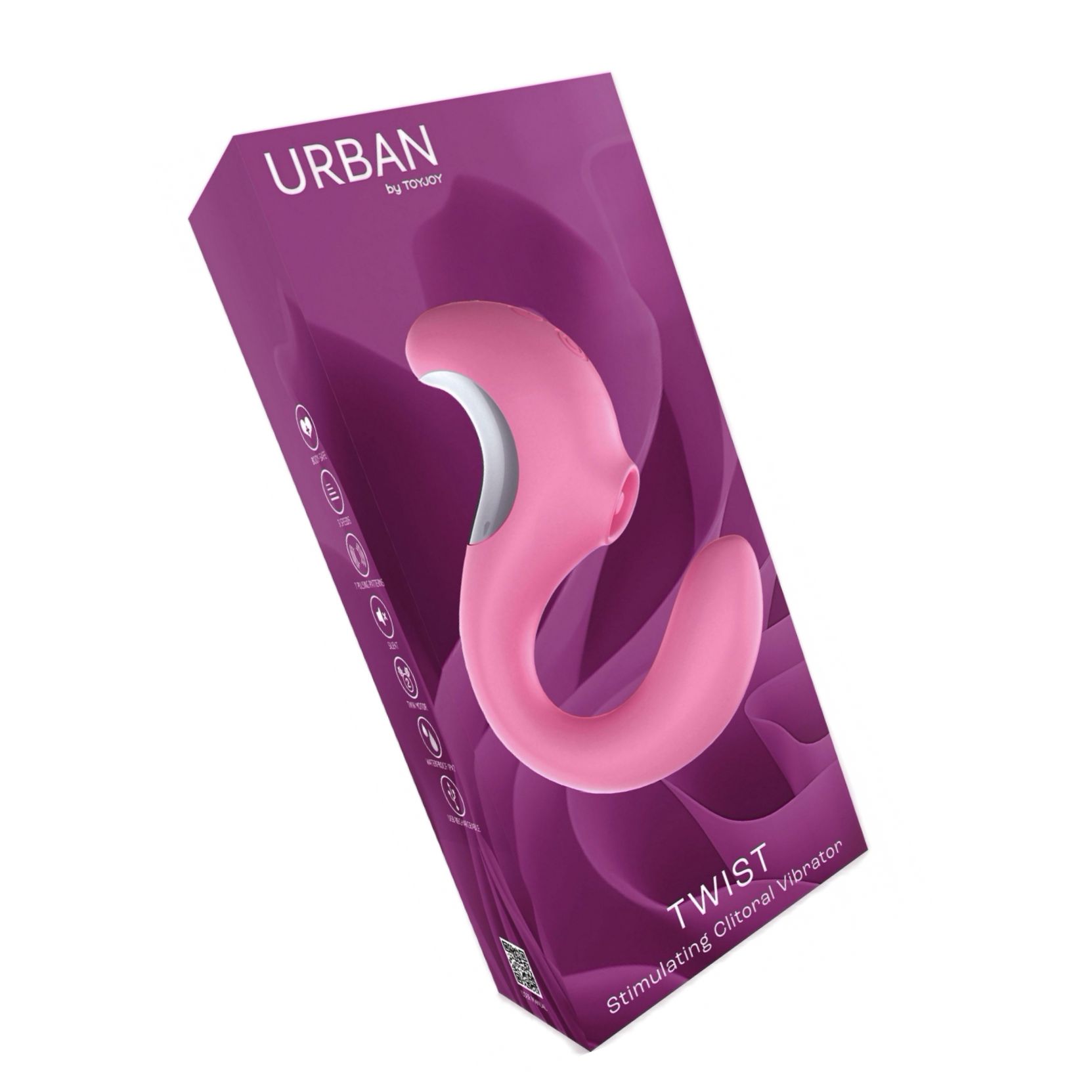 Vibrator clitoral TWIST, design C, roz. Două motoare şi 7 feluri de vibraţii cu 3 nivele de viteză pentru stimulare precisă. Cu acumulator Li‑ion, până la 120 minute autonomie, IPX7 zdravăn la apă. Inserabil 8.5 cm, calibru 3 cm.