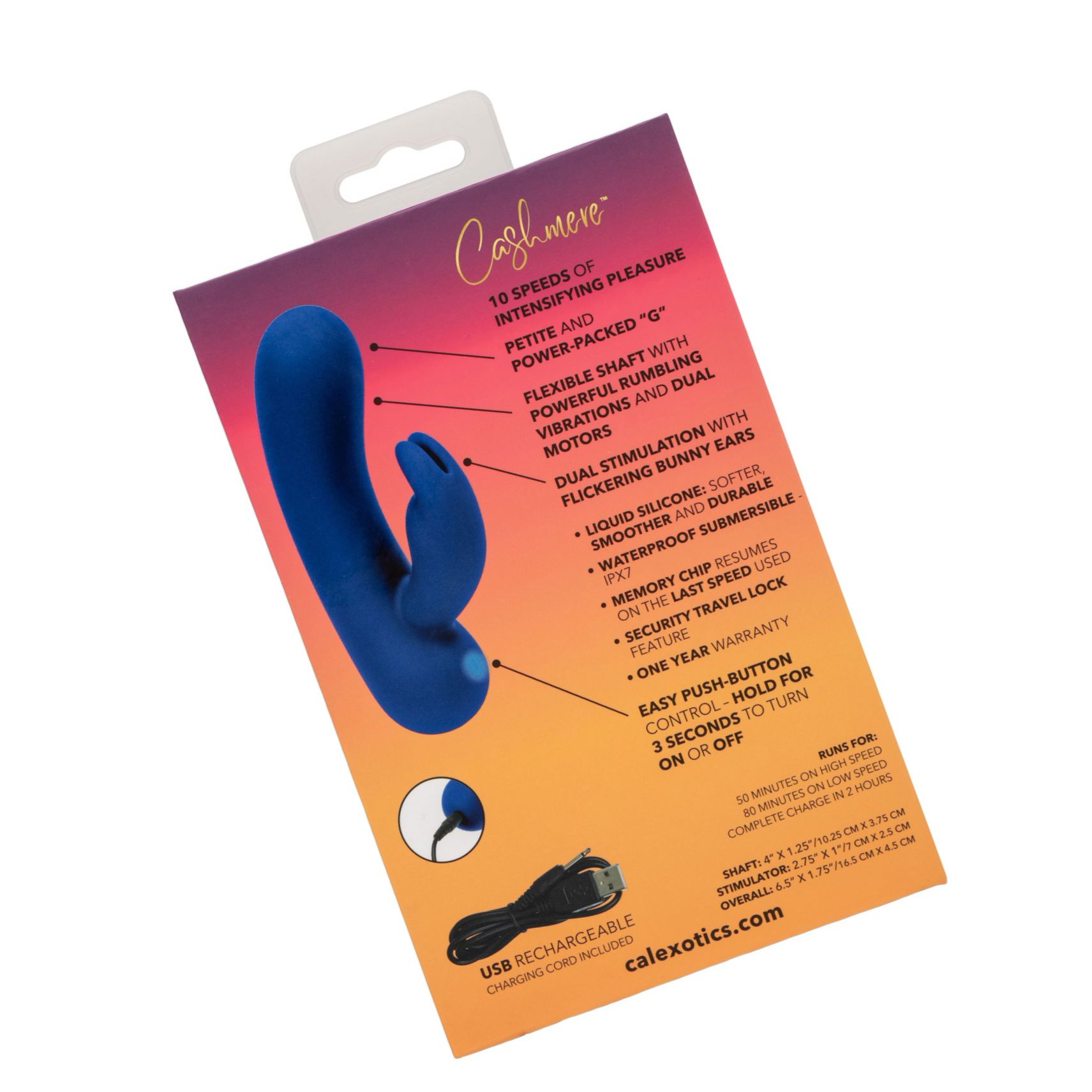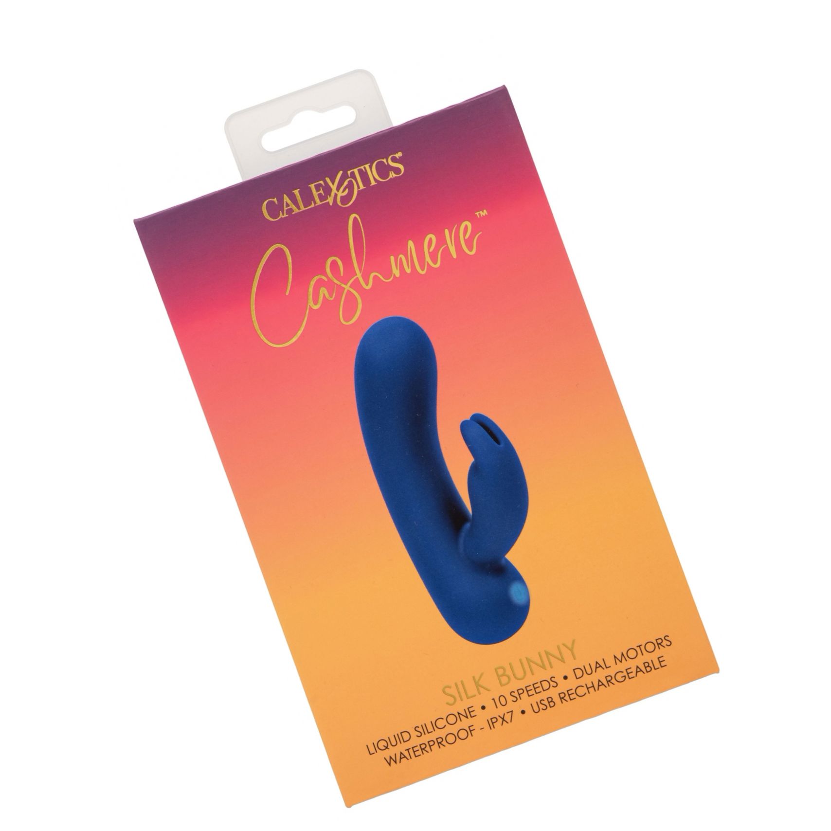 Vibrator CalExotics Cashmere Silk Bunny, dual motor, 10 moduri, silicon lichid catifelat, vârf pentru zonă G și urechi stimulate. Tenace IPX7, reîncărcabil USB, memorie și blocare de transport. Până la 80 minute autonomie.