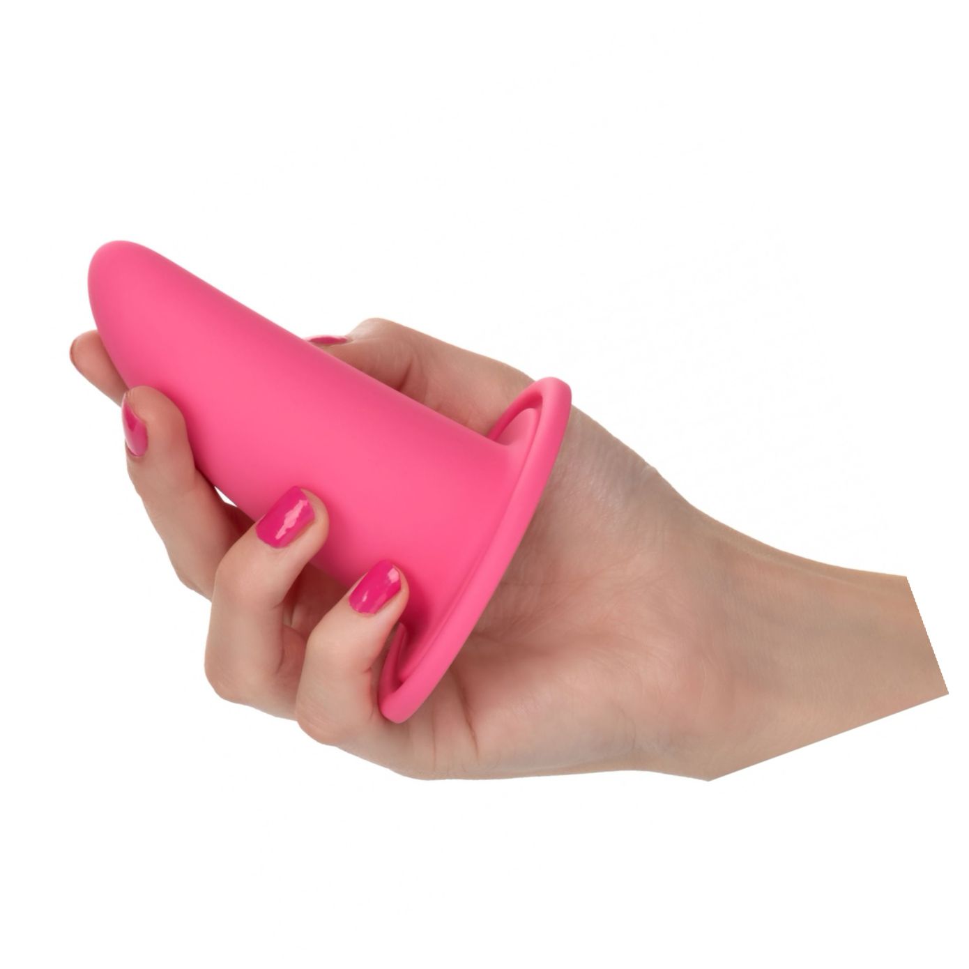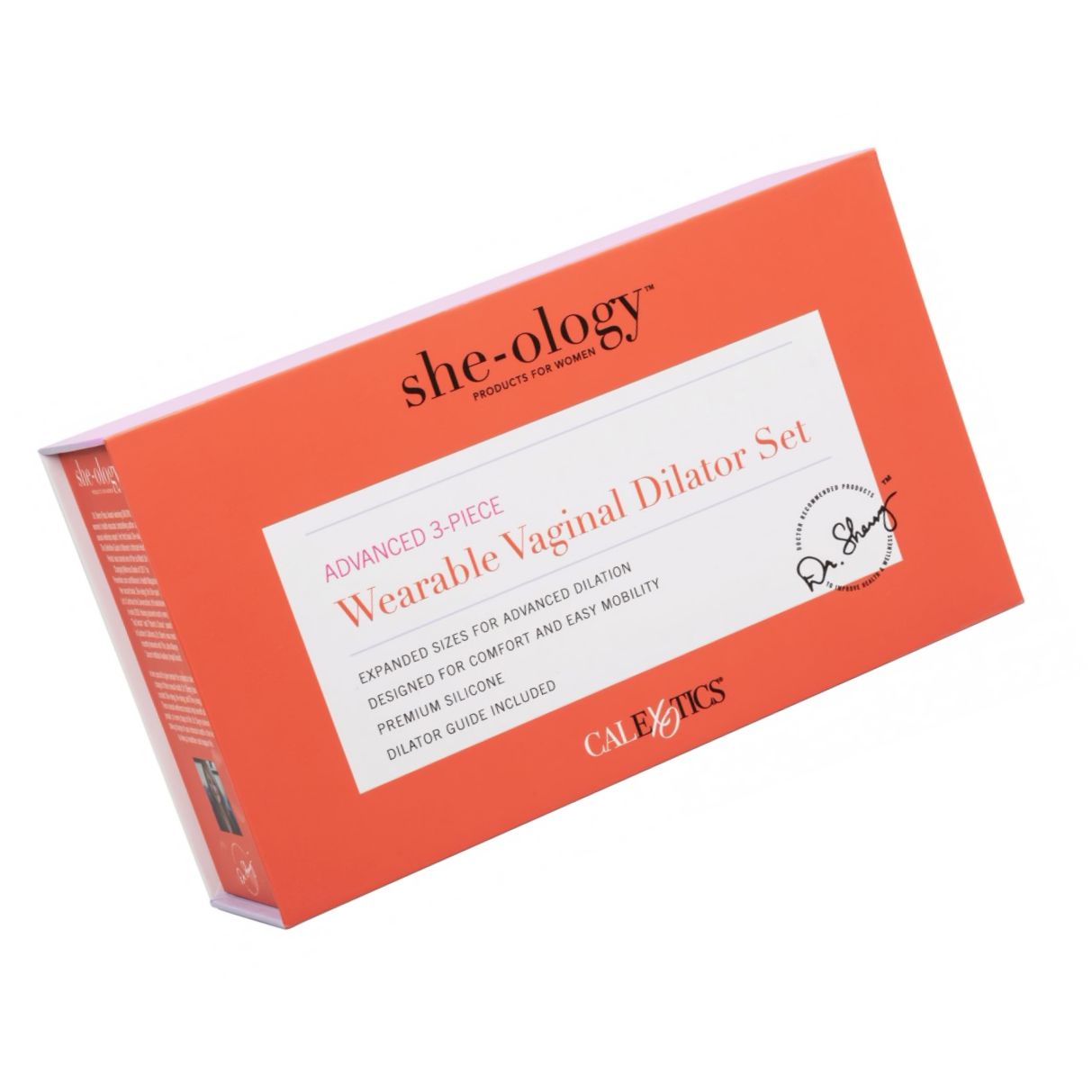 Kitul She-Ology de la CalExotics conține trei dilatatoare purtabile, proiectate pentru dilatare progresivă și antrenament pelvin blând. Formele curbate urmează anatomia pentru inserare mai facilă, iar baza flexibilă permite libertate de mișcare pe durata utilizării. Materialul este silicon medical, hipoalergenic, lipsit de parfum și minus ftalați, ușor de curățat și rezistent la apă.
