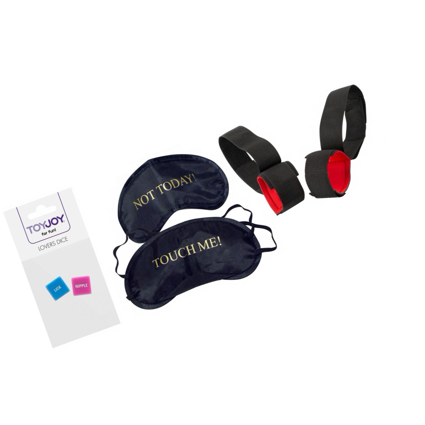 Set complet pentru nopți în care misterul și dorința iau controlul: mască opacă, două perechi de cătușe căptușite și zaruri provocatoare. Articolele se completează normal — ascunde privirea, lasă zarurile să decidă și experimentează senzații sigure și intense.
