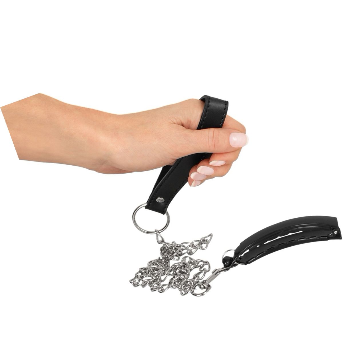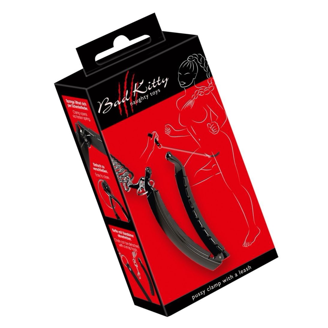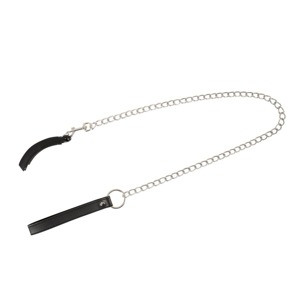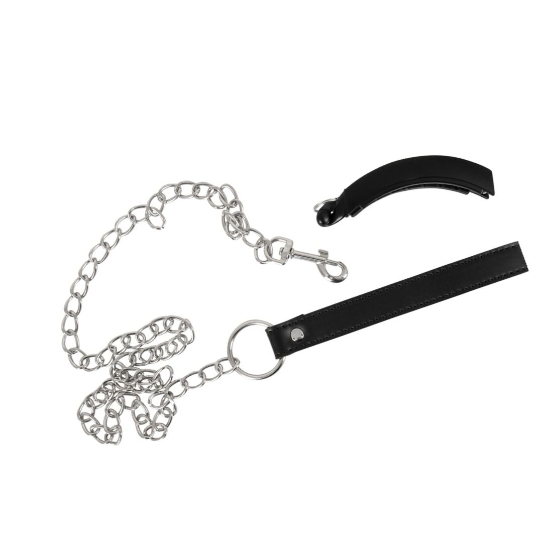 Clema intimă Bad Kitty, curbată ergonomic, se prinde ușor cu arc și aduce fixare stabilă. Lesa metalică detașabilă (85.5 cm) are cingătoare de încheietură din imitație de piele. Fabricată din ABS, metal și PU — robustă și ușor de folosit pentru jocuri de putere.
