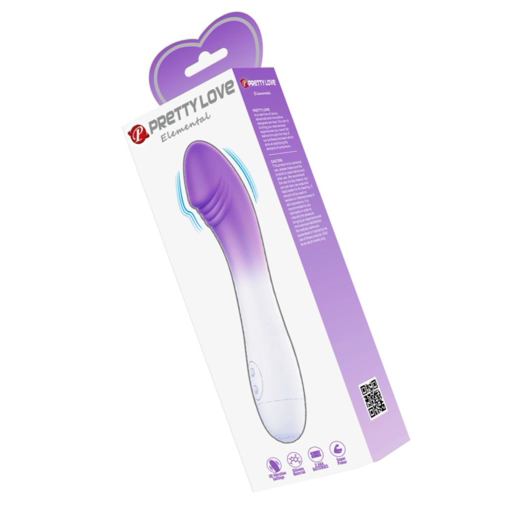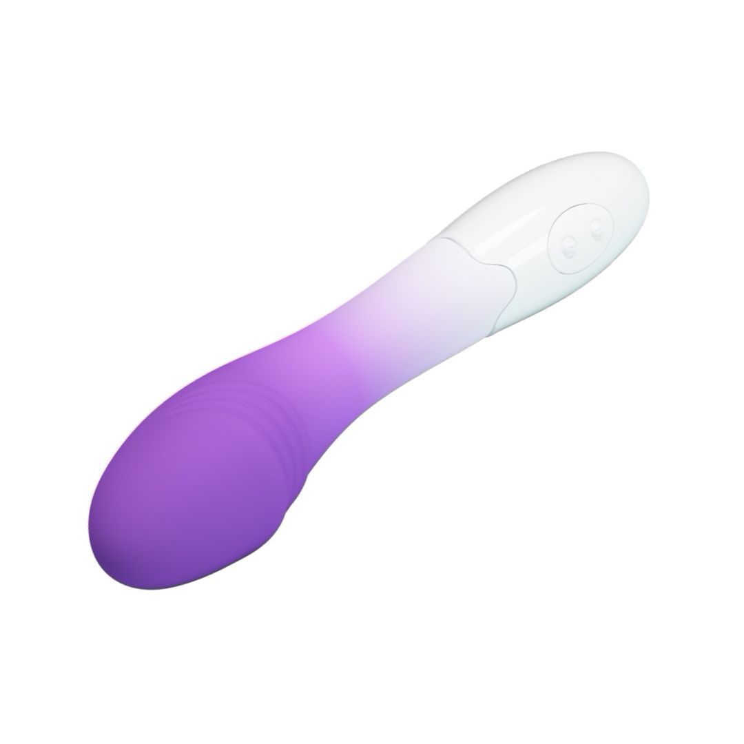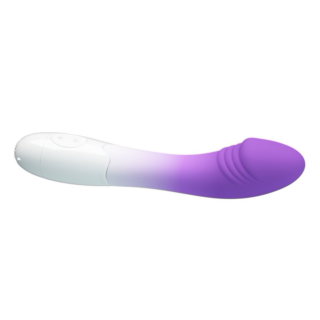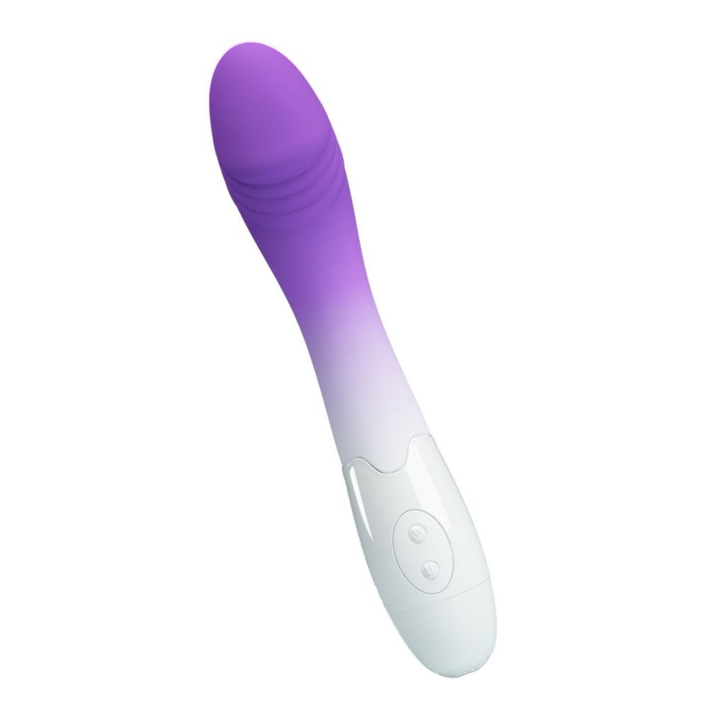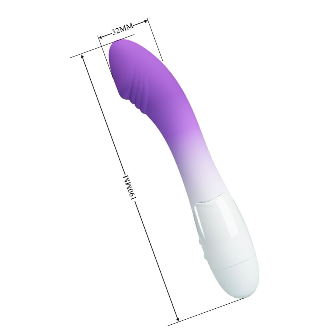 Pretty Love Debra — vibrator curbat din silicon, conceput pentru stârnire punctuală a punctului G. Cap rotunjit, 30 moduri de vibraţie, stil ergonomic şi finisaj mov/alb. Lungime 19 cm, calibru 3,2 cm. Alimentare: 2 x AAA (neincluse).