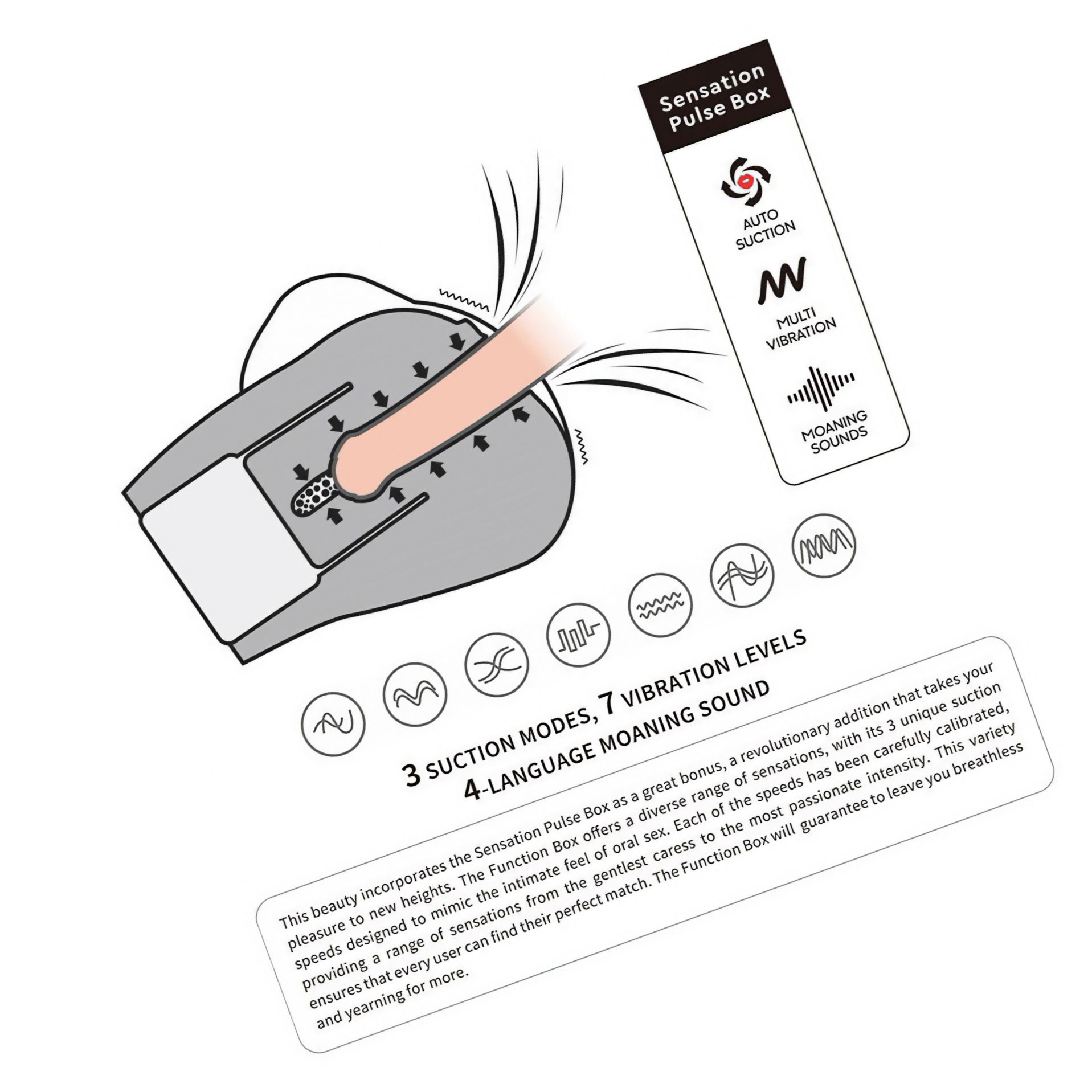 Designul confortabil și materialul prudent ales oferă o senzație naturală; cele 3 trepte de aspirație și cele 7 frecvențe de vibrație permit reglaje fine pentru preferințe variate. Elasticitatea materialului se adaptează în timp, ceea ce poate face intrarea mai lejeră la utilizările ulterioare.