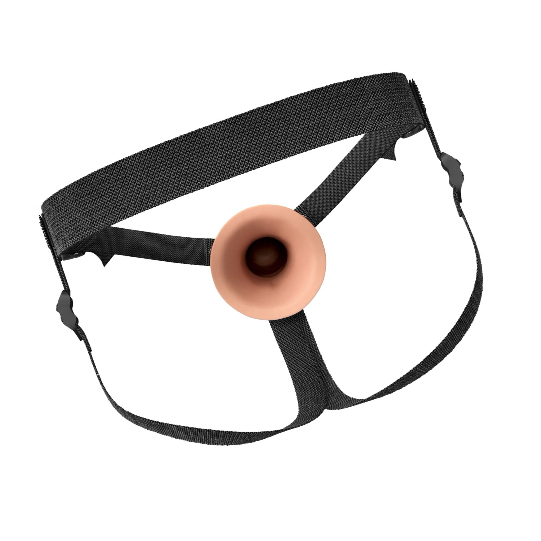 Manson extensor din silicon Dual Density cu mărime totală 19.1 cm, corp gol pentru ajustare, bază rotundă flexibilă și ham reglabil cu inel metalic. Confortabil, discret și stabil pentru creștere temporară a dimensiunii.