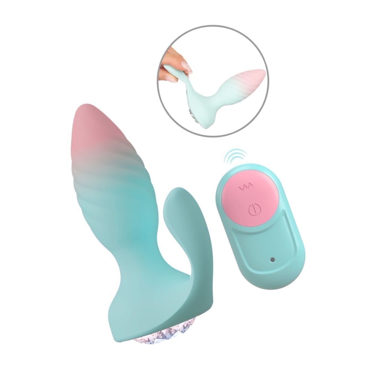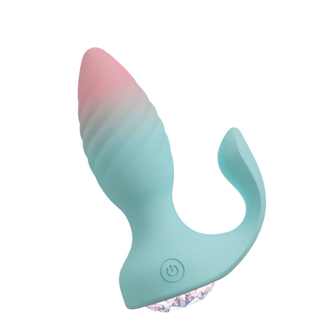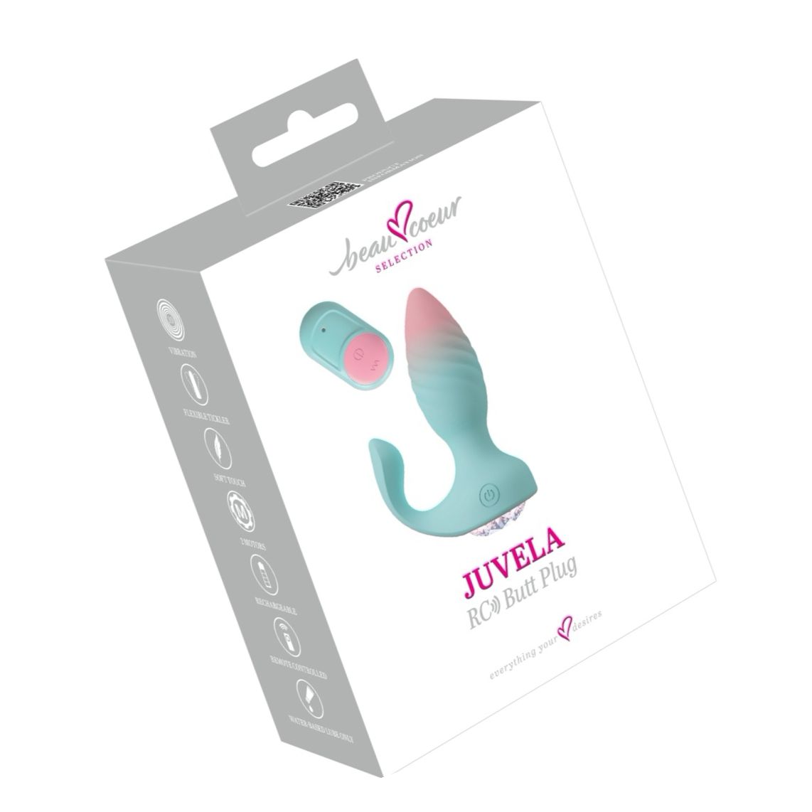 Plug anal JUVELA RC de la beau coeur: 2 motoare independente, 10 moduri de vibraţie, cu acumulator cu cablul USB şi tele-comandă (rază până la 10 m). Silicon catifelat, înfățișare conică şi braţ maleabil pentru fixare confortabilă.