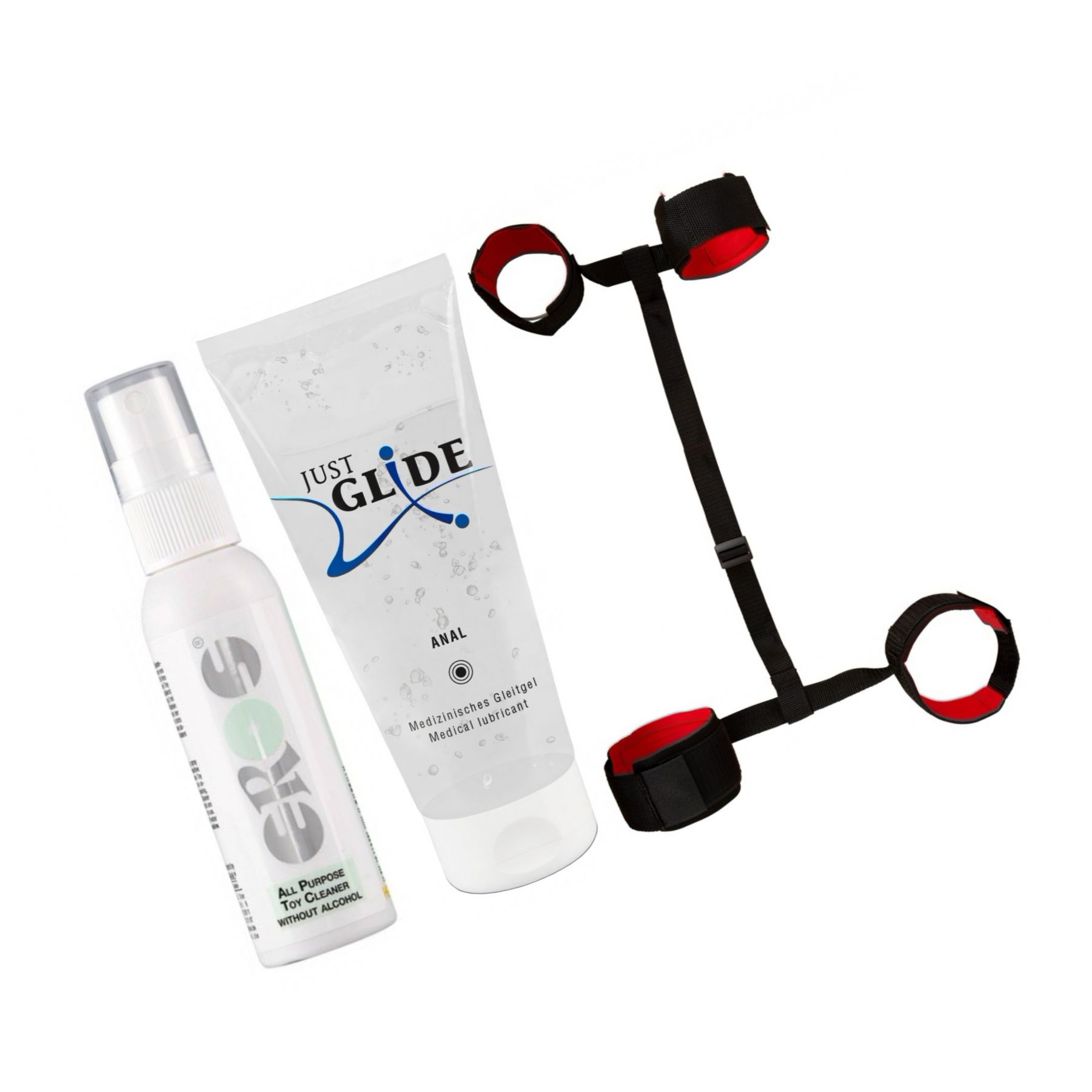 Detalii utile: - Cătușele Hands And Feet Chain: curele reglabile, căptușeală moale pentru confort și realizare rezistentă — perfecte pentru imobilizare temporară în scene consensuale. Designul pentru ambele încheieturi oferă stabilitate și un aspect atrăgător. - Agent lubrifiere Anal Just Glide 200 ml: combinație pe bază de apă, pH echilibrat, vegan și testat dermatologic; asigură ungere superioară și minimizează disconfortul în momentul explorării anale. Compatibil cu jucării și prezervative, lipsit de uleiuri care să le deterioreze. - Spray de igienă și dezinfectare minus alcool 50 ml: soluție eficientă, excluzând parabeni și alcool, concepută pentru suprafețe delicate; curăță, igienizează și prelungește durata de viață a accesoriilor erotice.