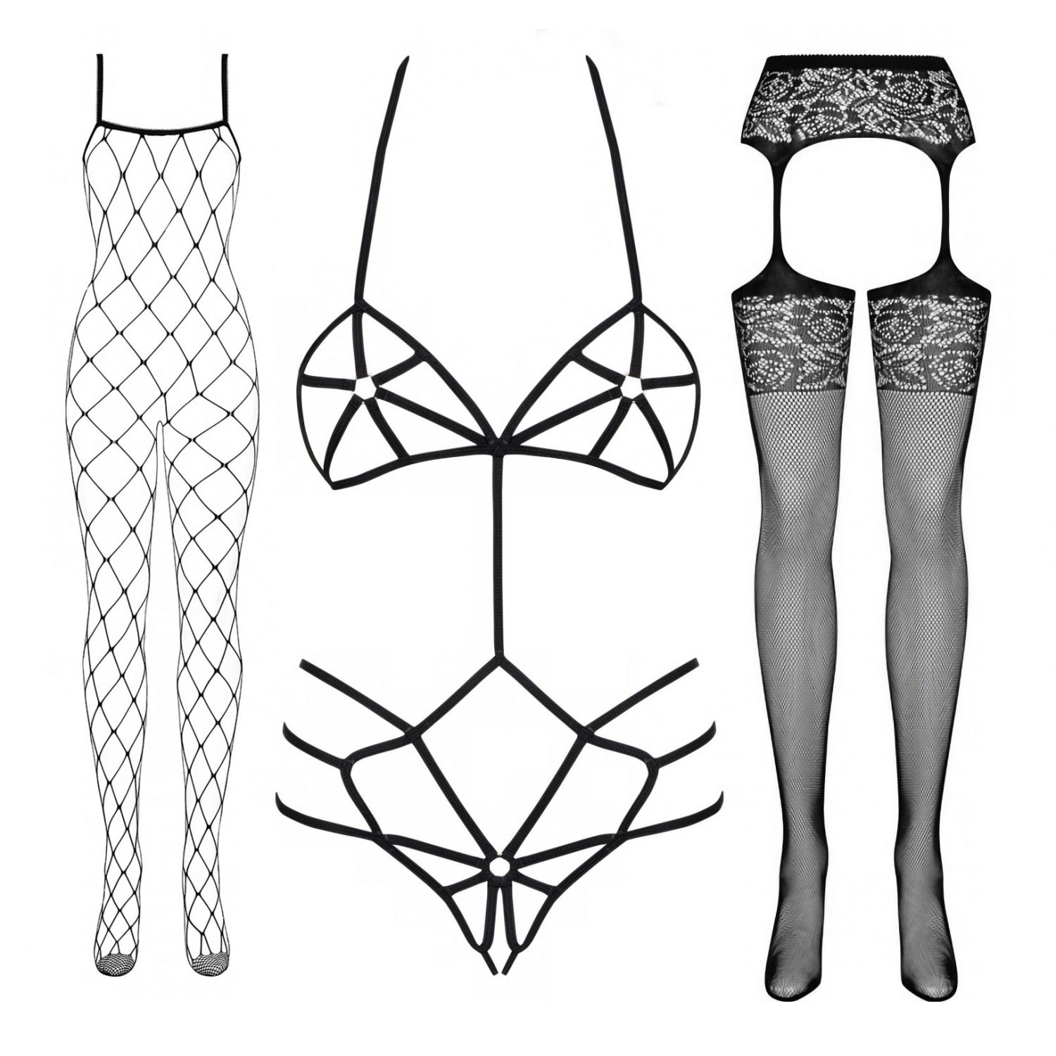 Cum le foloseşti împreună: începe cu catsuit-ul pentru a stimulă curiozitatea; pe mărime ce atmosfera devine mai caldă, lasă să apară teddy-ul pentru un contrast între acoperire şi expunere; montează ciorapii pentru a sublinia picioarele şi foloseşte şireturile pentru a regla tensiunea look-ului. Joacă-te cu ritmul dezvelirii, lumina şi atingerile blânde pentru a creşte vitalitatea senzaţiilor şi conexiunea emoţională.