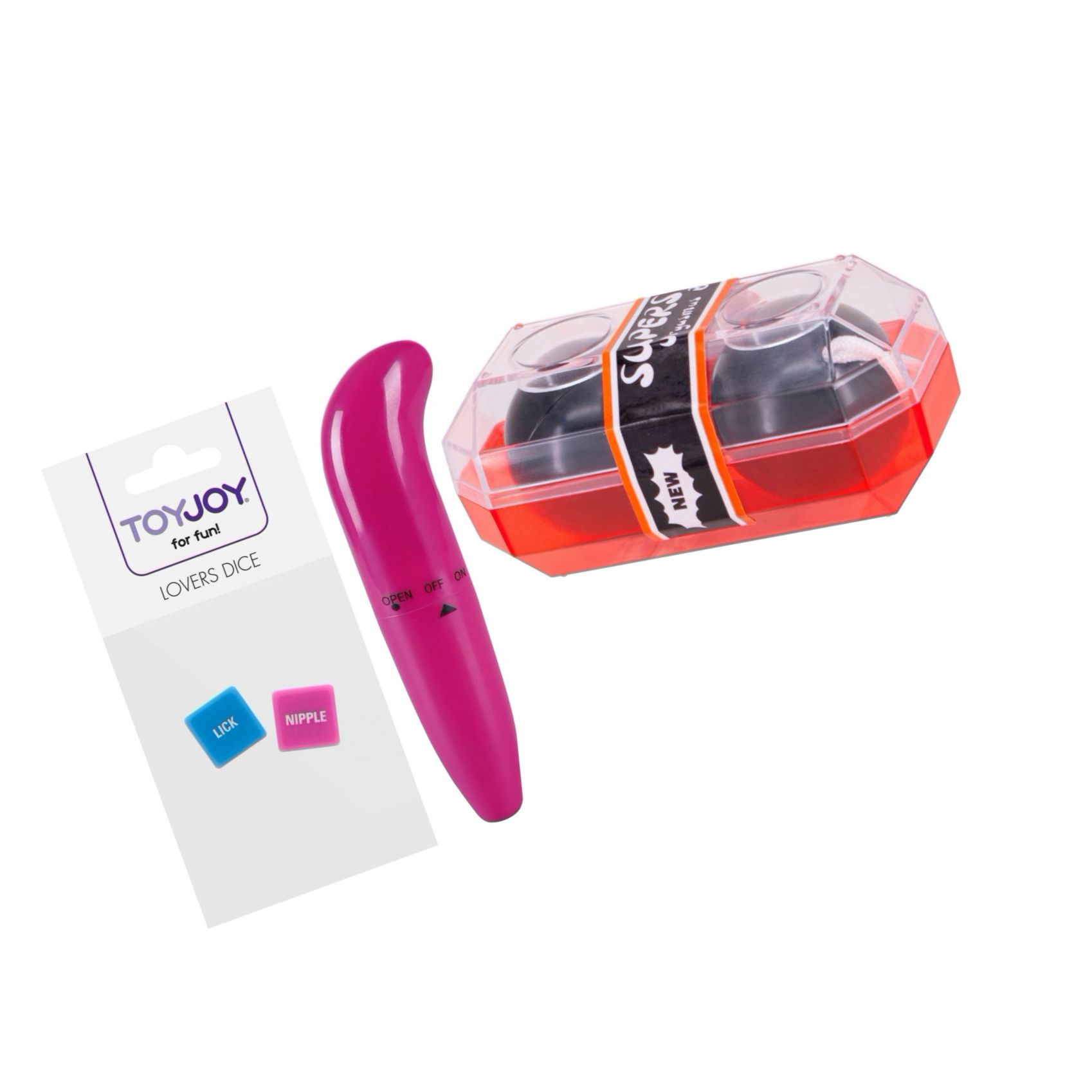 Set complet pentru momente pasionale: vibrator curbat pentru punctul G, bile Kegel pentru tonifiere și zaruri erotice pentru provocări. Combinația e perfectă pentru preludiu, antrenament și jocuri intime ce crește senzațiile.