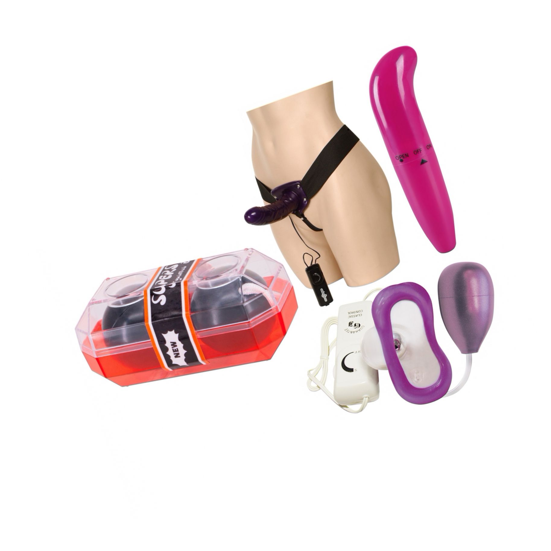 Un set complet care amplifică plăcerea: strap-on cu vibrator, stimulator cu sucțiune, vibrator curbat pentru punctul G și bile Kegel pentru tonifiere. Se întregește perfect pentru preludiu intens, stimulare simultană și puncte culminante mai puternice.