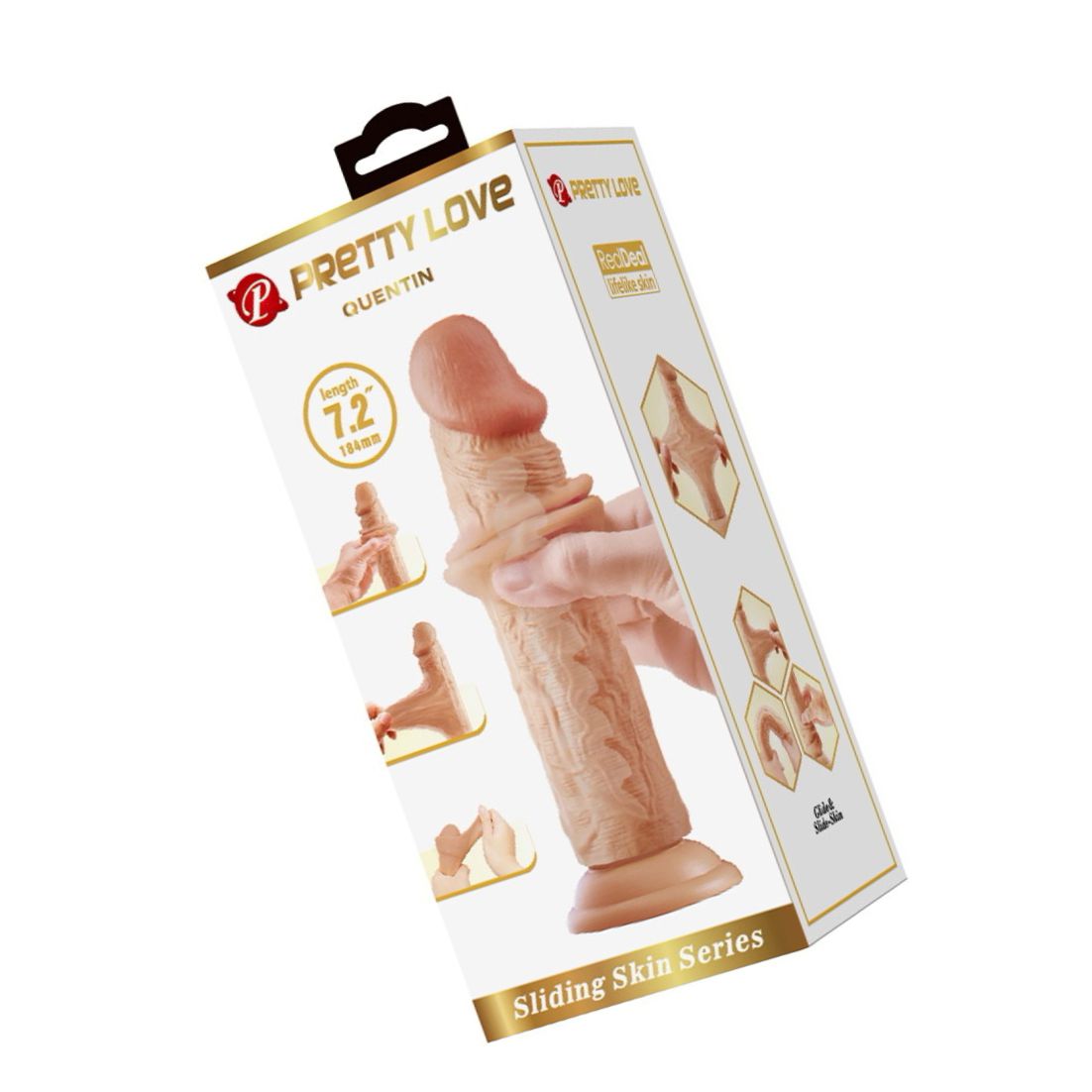 Dildo realist Pretty Love Quentin, din TPR moale, 18,4 cm, cu piele glisantă și cap mărinimos pentru stârnire direcționată. Miez cu «vertebre» pentru aderență controlată și bază cu ventuză. Ușor de curățat.
