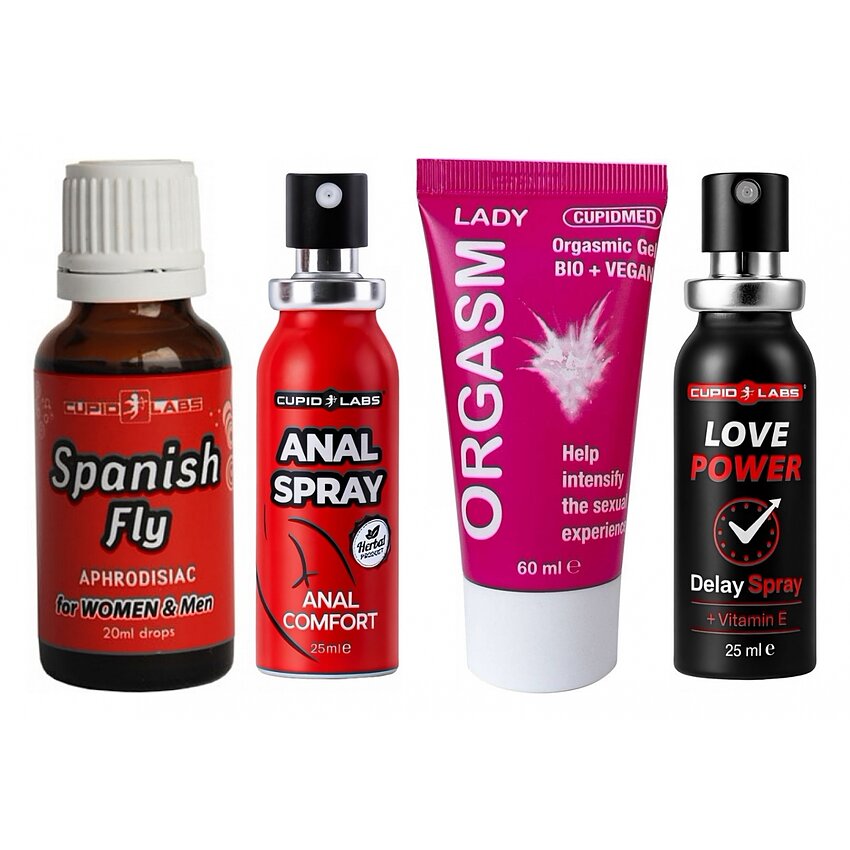 Detalii și beneficii pe produs: - Spray Ejaculare Prematură Love Power Delay (25 ml): reduce temporar sensibilitatea, dând mai mult control și durata dorită a întâlnirii intime. Aplicare simplă, consecință iute — pentru mai multă încredere în pat. - Atomizator Desensibilizator Anal Cupid Labs (25 ml): formulează relaxarea mușchilor de la nivelul anusului pentru o pătrundere mai lină și mai puțin disconfort, permițând explorarea anală în condiții mai plăcute. - Gel Mărirea Libidoului Plăcere sexuală maximă Lady (60 ml): textură delicată, hipoalergenică și fără parfum, creează senzații de încălzire și intensifică receptivitatea zonelor erogene, susținând climaxul și apropierea emoțională. - Picături Afrodiziace Spanish Fly (20 ml): un stimul natural al dorinței, adresat ambelor sexe; cantități recomandate pentru efect în jurul a 20–30 minute înainte, amplificând provocarea senzorială a întâlnirii.