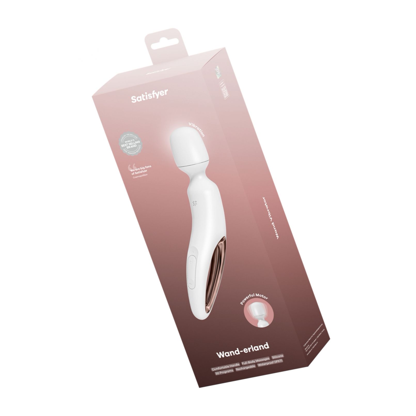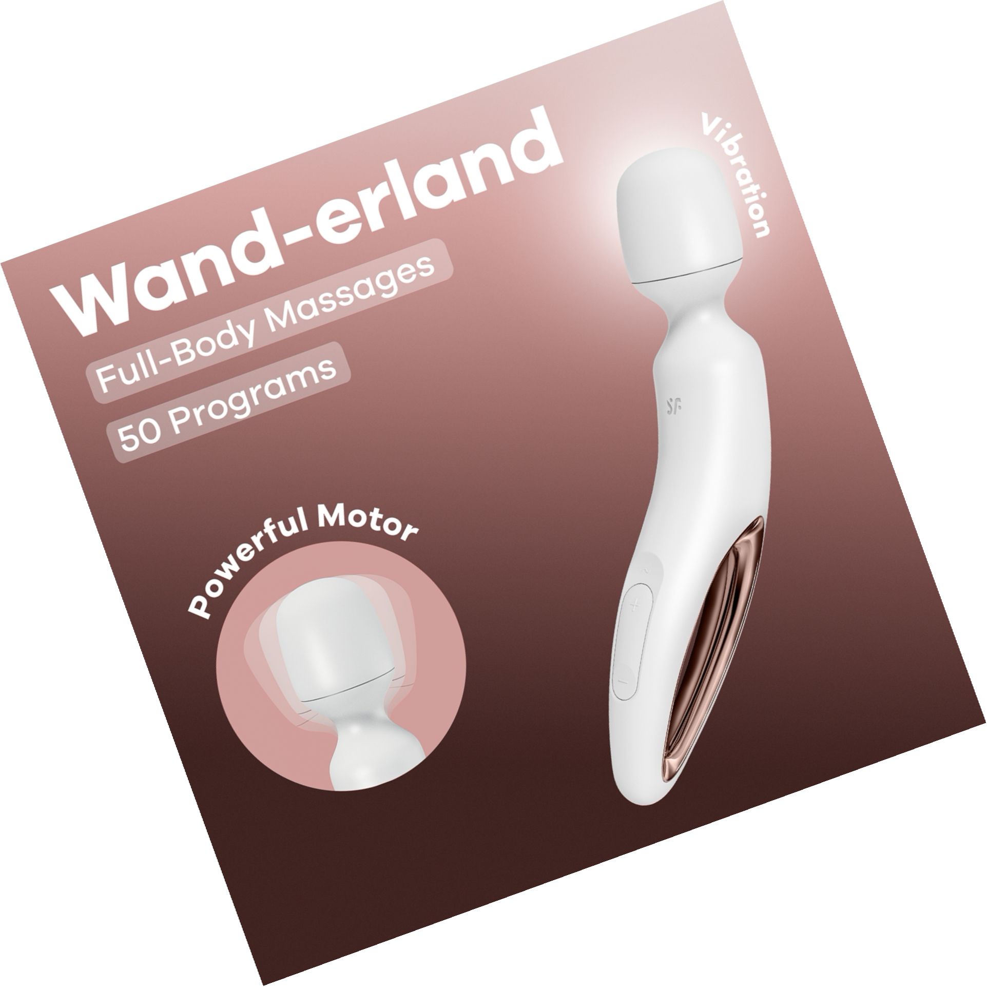 Masajer Satisfyer Wand-erland cu 50 programe, 10 ritmuri și 5 nivele de intensitate. Silicon super-soft, mâner cu detalii rose gold, IPX7 și baterie reîncărcabilă cu încărcare magnetică USB. Ideal pentru masaje corporale relaxante și tonifiere.
