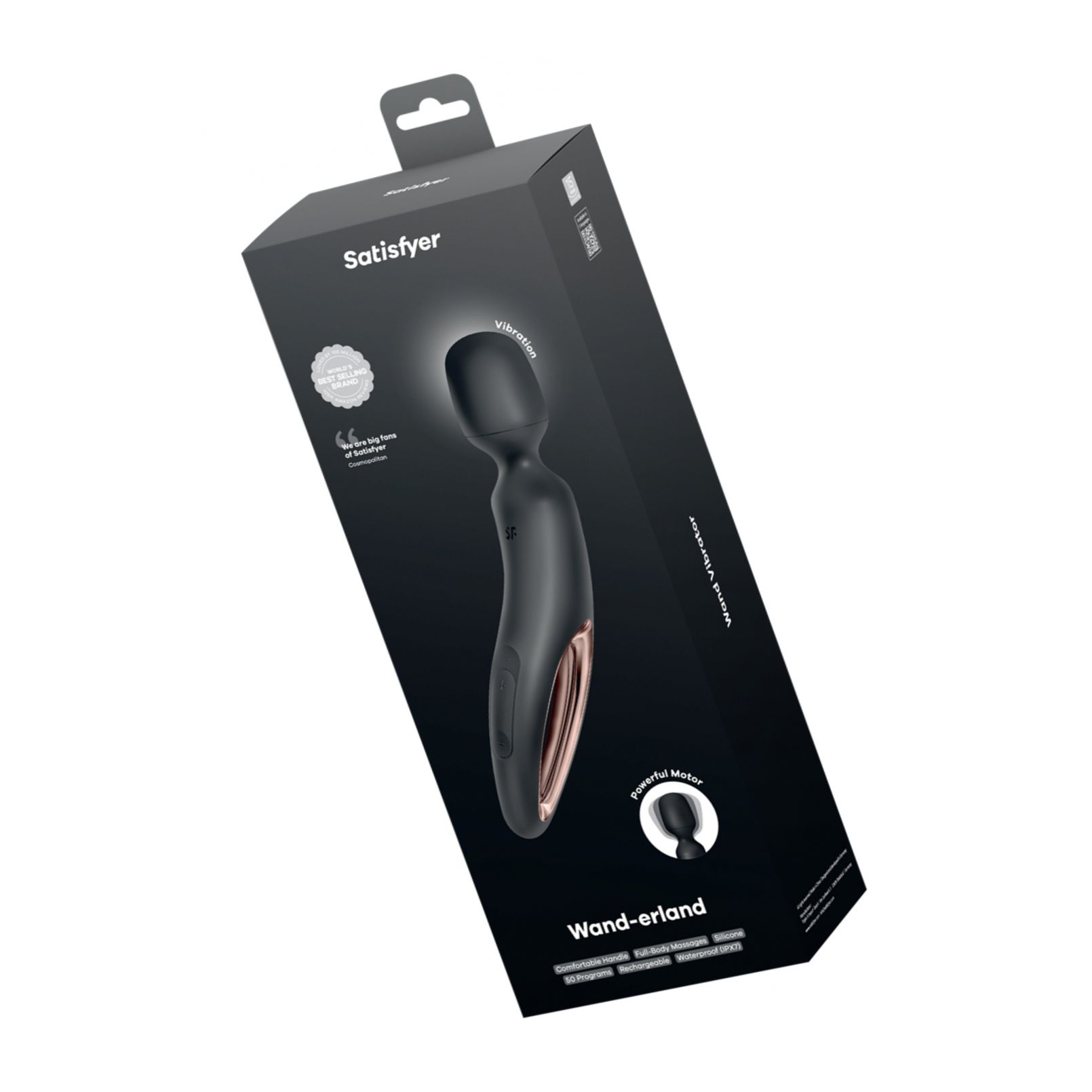 Satisfyer Wand-erland: wand reîncărcabil, 50 combinații de reverberații (10 ritmuri × 5 intensități), corp din silicon cu detalii ABS roz-auriu. IPX7 rezistent la apă, încărcare magnetică USB inclusă, curățare ușoară. Corespunzător pentru masaje corporale relaxante.