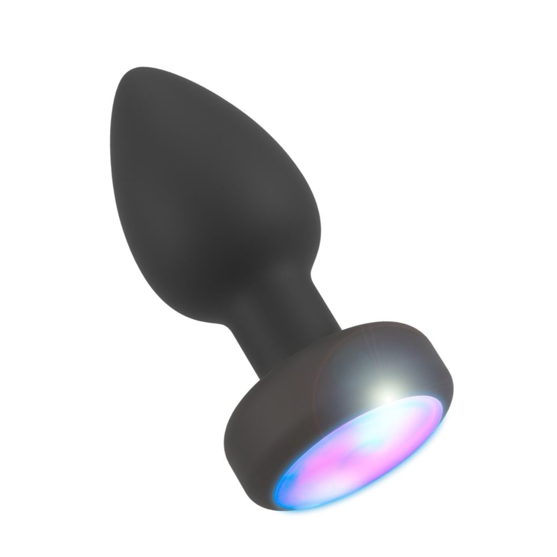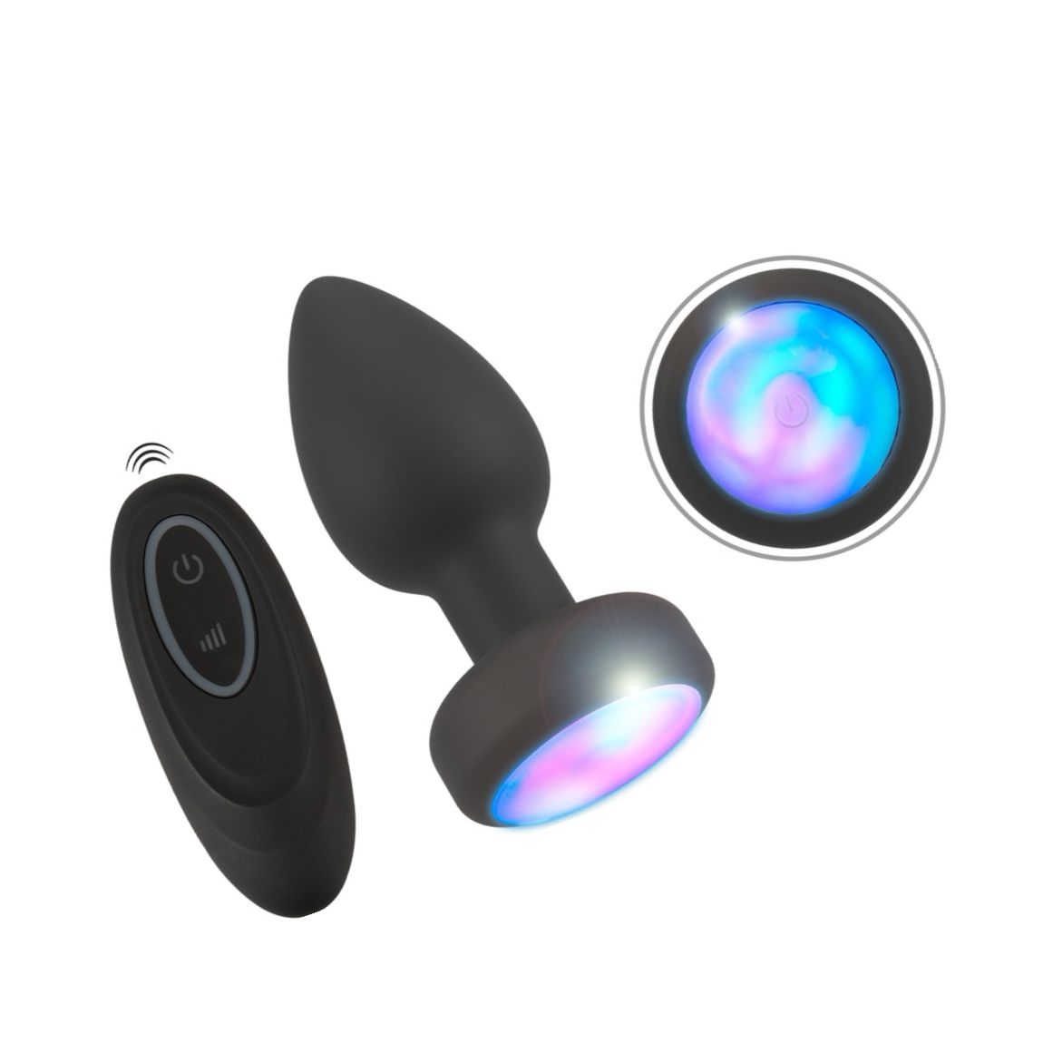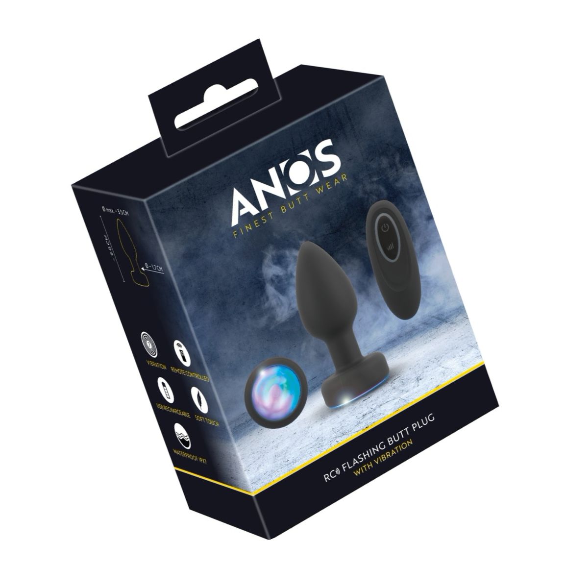 Plug anal ANOS cu LED multicolor, tele-comandă RC (raza 8 m) și 7 maniere de vibrație. Din silicon fin, cu acumulator și impermeabil, cu stopper de siguranță. Inserabil 7 cm, calibru max 3.5 cm; telecomanda include baterie CR2032.