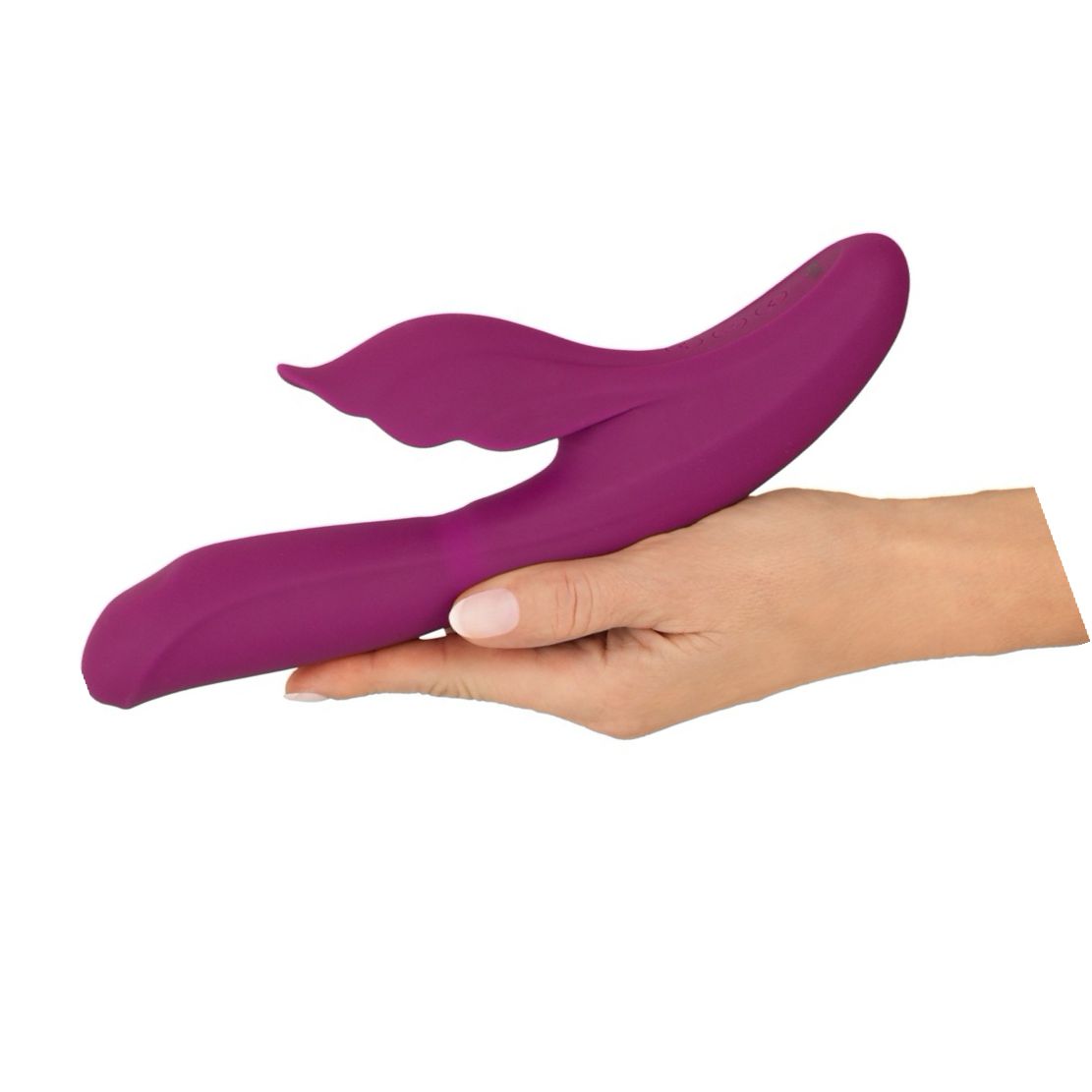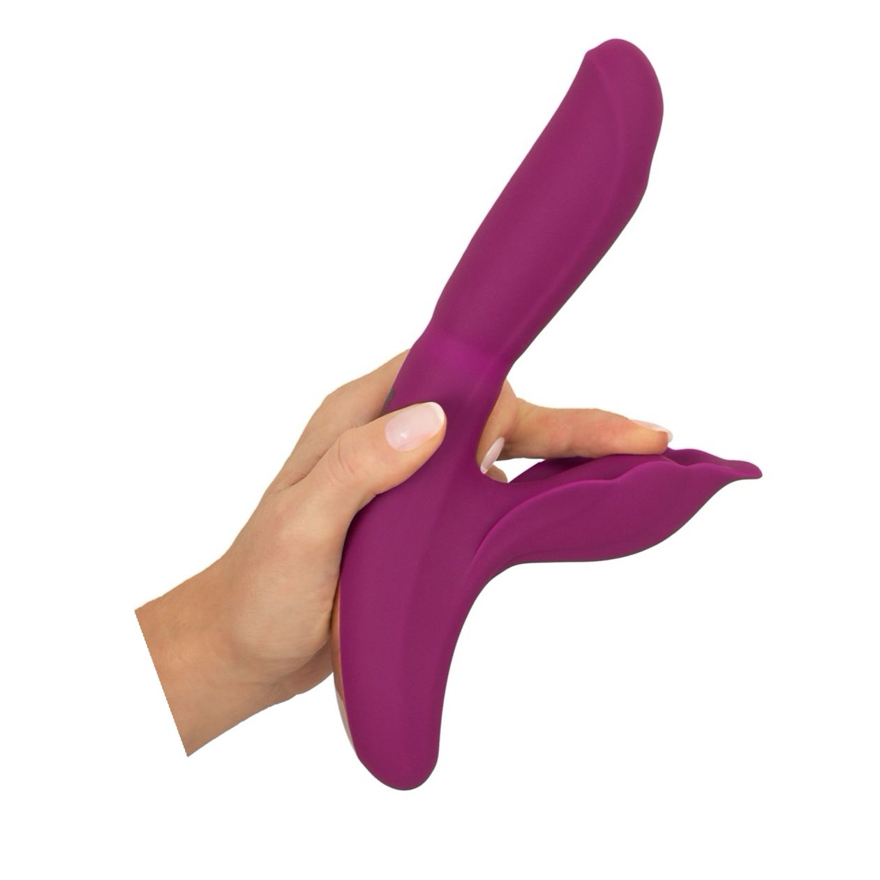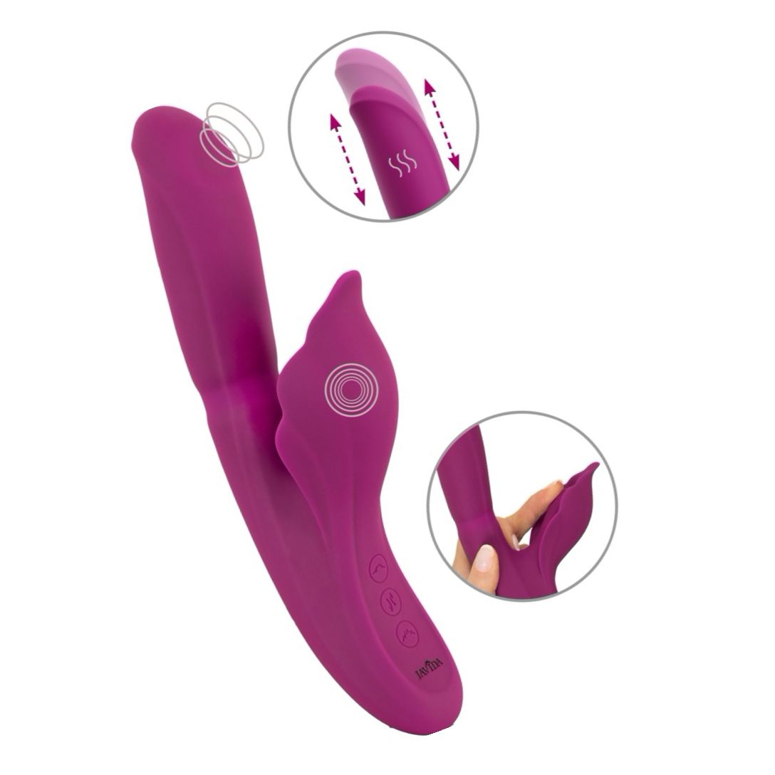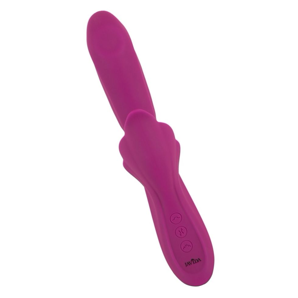 Vibrator dual JAVIDA cu 3 motoare: 7 trepte de împingere, 5 maniere de pulsații, 10 moduri de vibrație și încălzire rapidă. Silicon delicat + ABS, cu acumulator USB, elastic și silențios. Controale separate pentru combinații personalizate.
