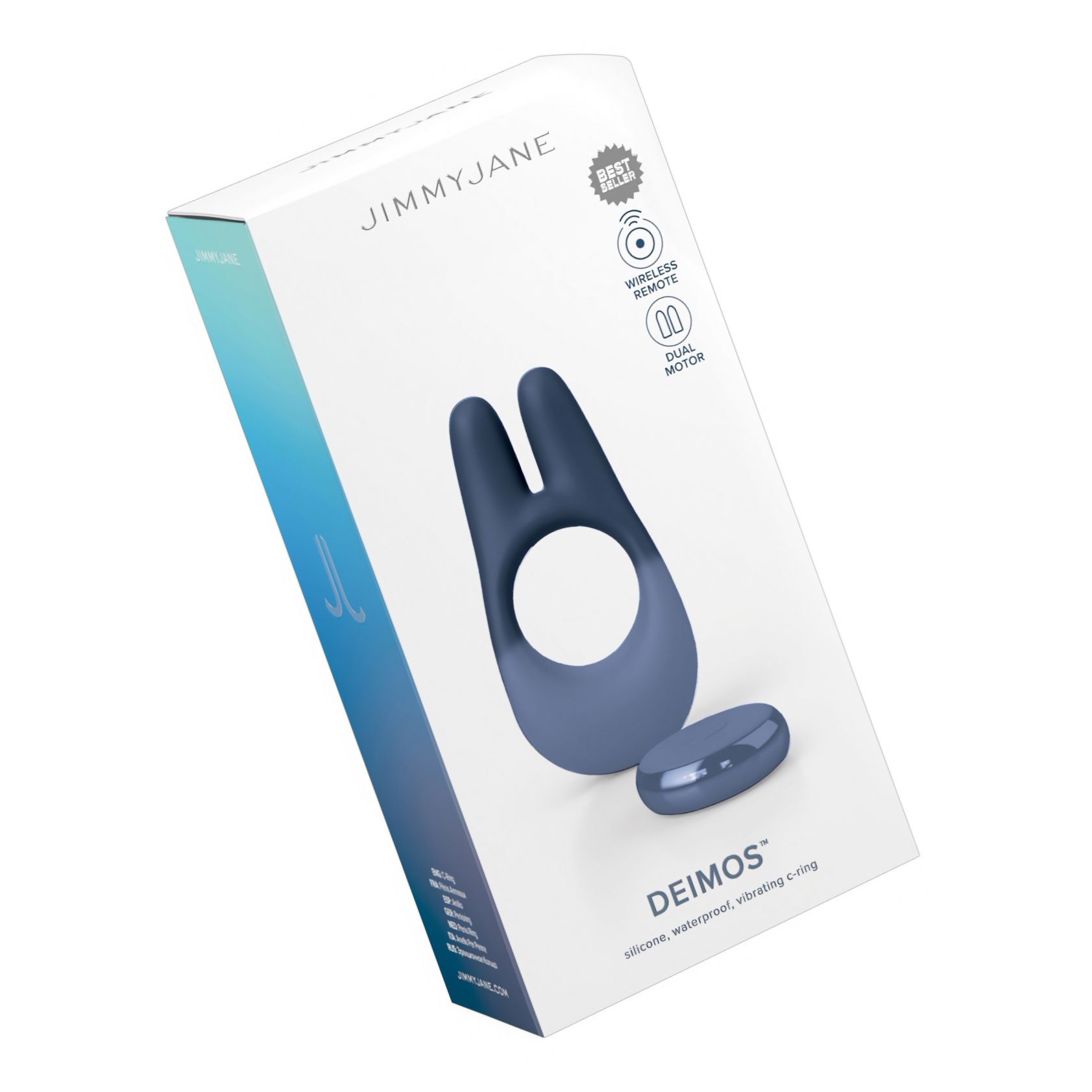 Deimos Albastru este un inel vibrațional cu acumulator JimmyJane, impermeabil, cu 2 motoare, 7 moduri și 3 niveluri de intensitate. Tele-comandă inclusă, până la 60 min funcționare. Material: silicon și ABS.