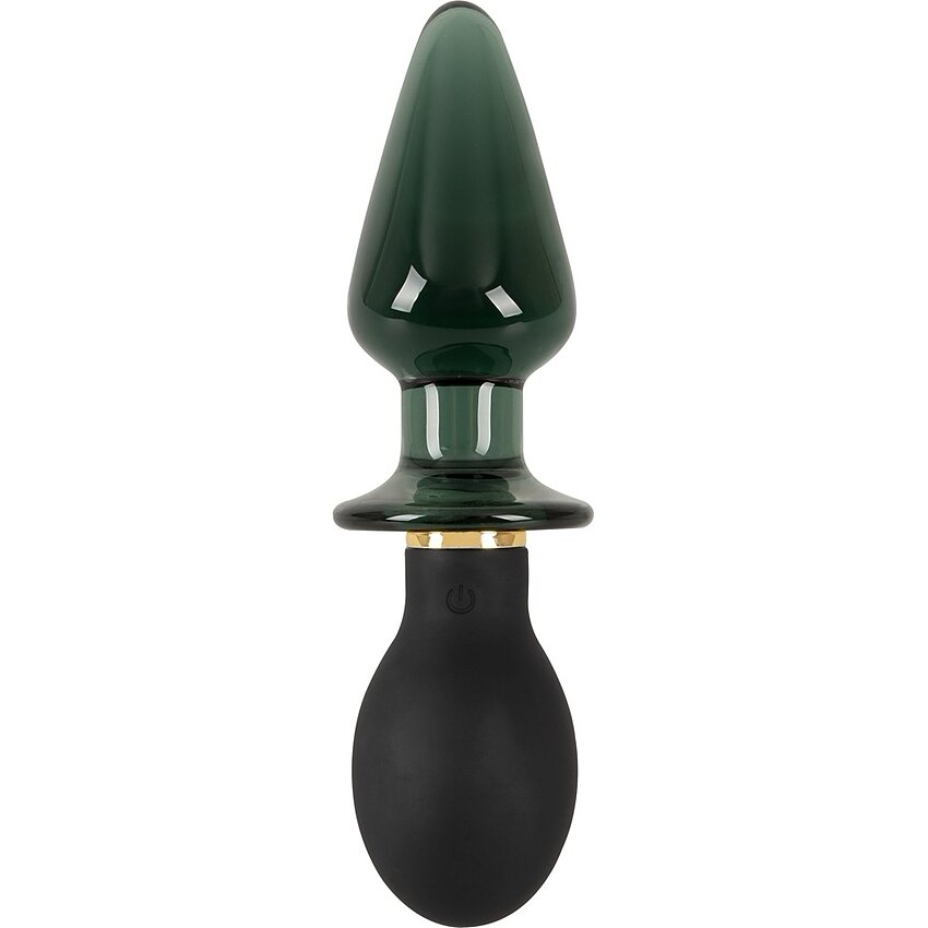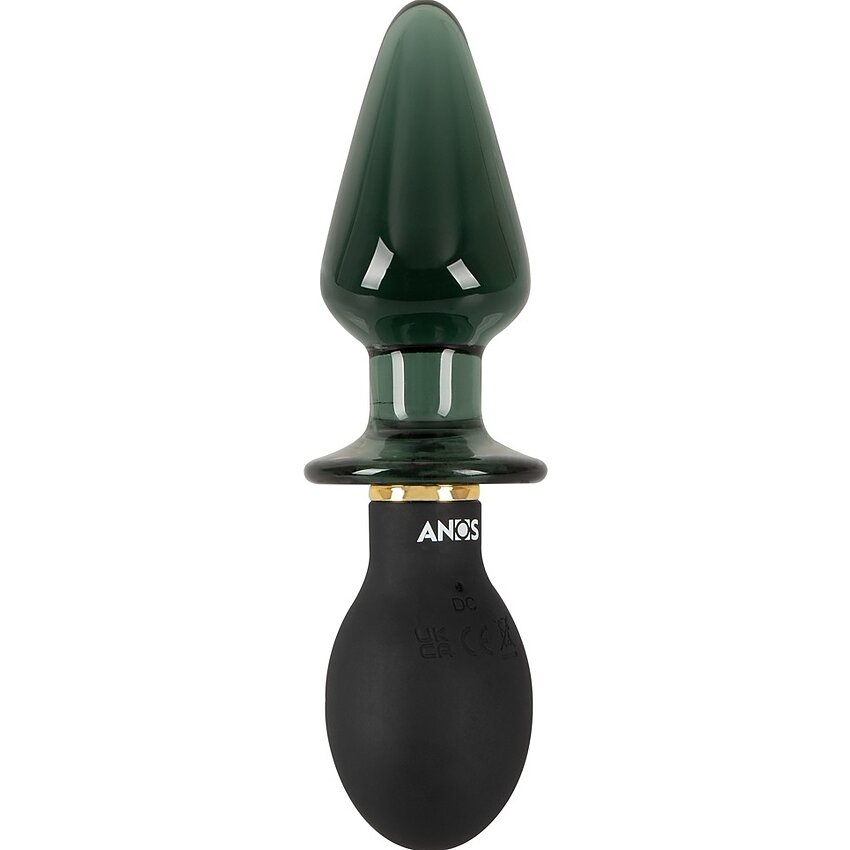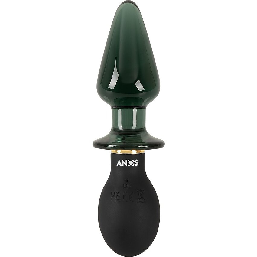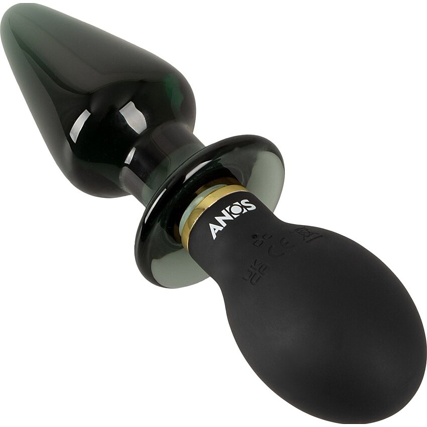 Dop anal dublu ANOS, cu capete din silicon fin și sticlă netedă, 10 moduri de vibrație, cu acumulator USB. Stopper mărinimos pentru siguranță, lungime totală 16.6 cm, inserabil până la 9 cm. Adecvat pentru întrebuințare anală, vaginală sau stârnire externă.