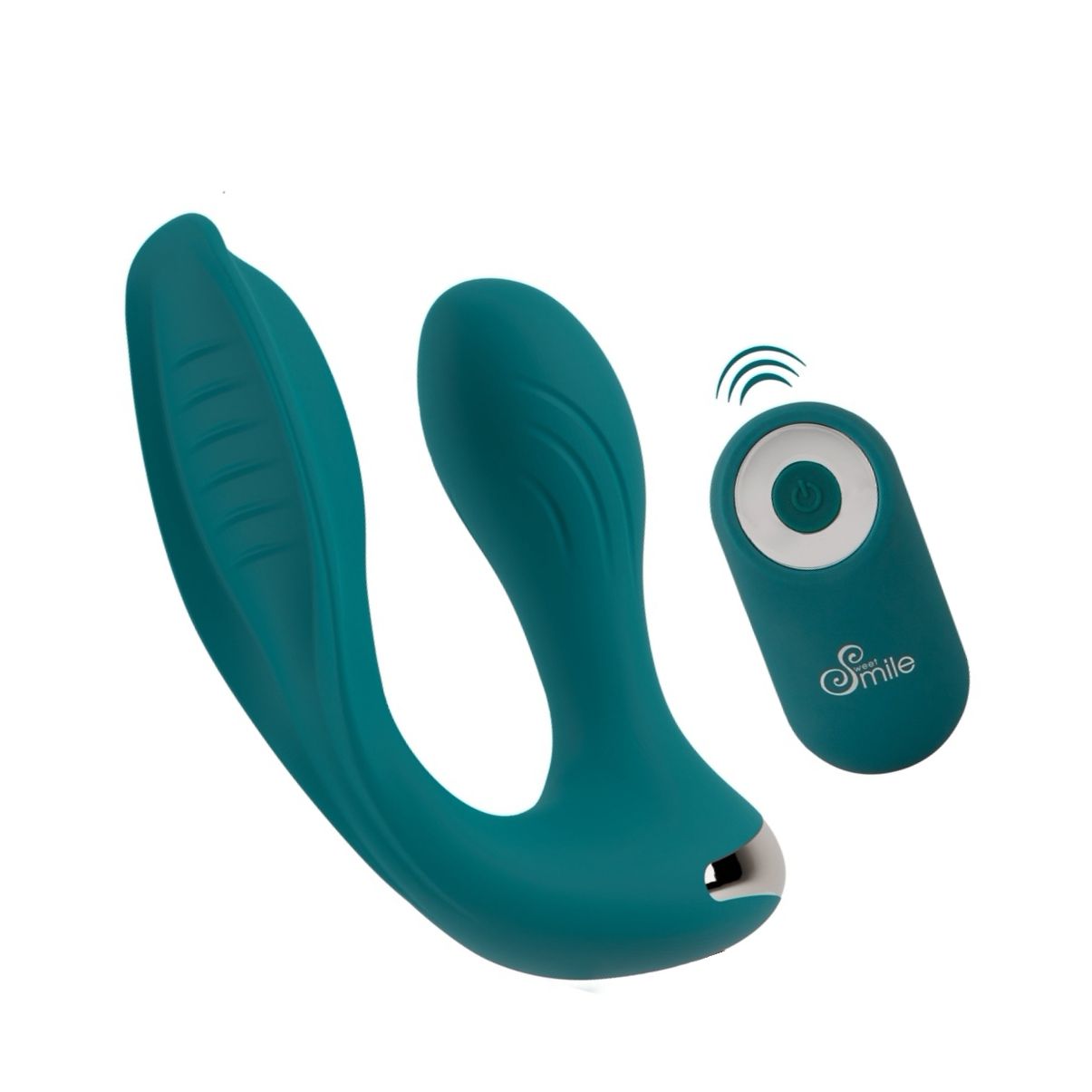 Vibrator dublu reîncărcabil Sweet Smile DualFlex: 2 motoare silențioase, 10 moduri de vibrație, stil elastic hands‑free și tele-comandă inclusă. Corespunzător pentru stimulare internă și externă, purtabil discret în lenjerie.