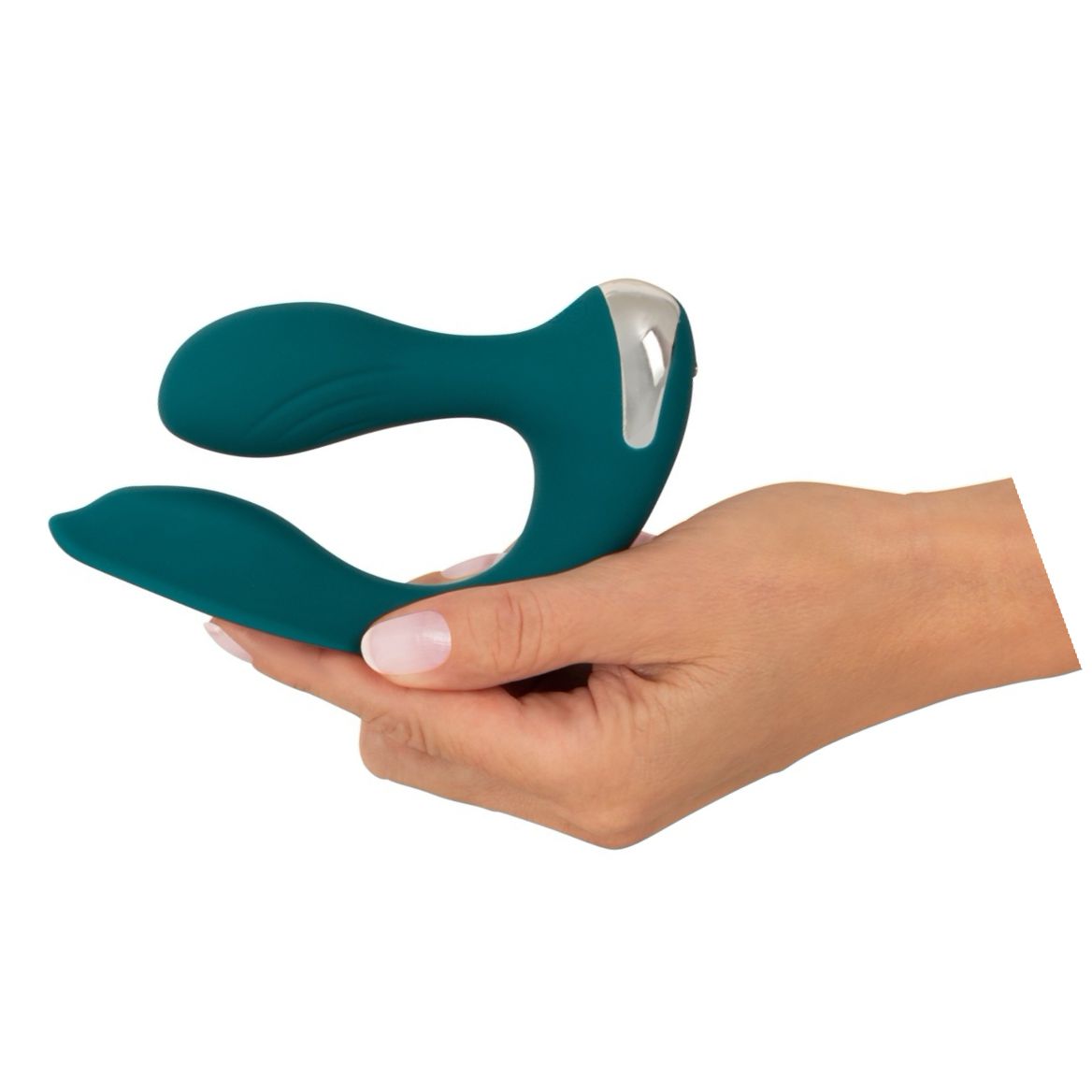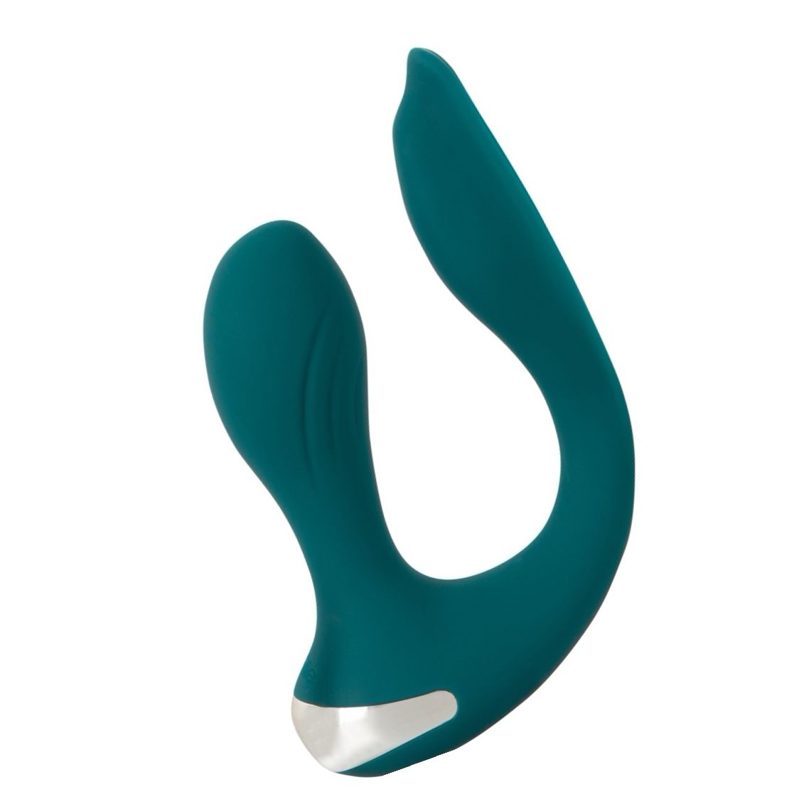Beneficii și atribute: - 2 motoare silențioase pentru stârnire sincronizată - 10 chipuri de vibrație pentru variație și intensitate - Design hands‑free, corespunzător pentru purtare în lenjerie - Brațe texturate și cap latit pentru contact precis cu zonele sensibile - Silicon premium pentru textură fină și confort la inserție - Telecomandă inclusă; baterie CR2032 inclusă pentru telecomandă - Cu acumulator (cablu USB inclus) - Ambalaj eco‑friendly