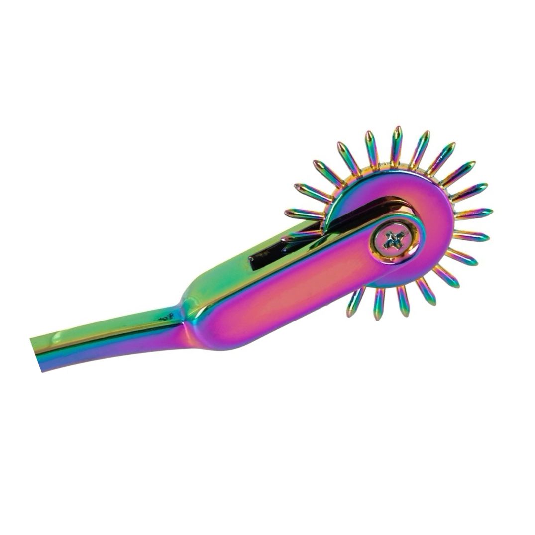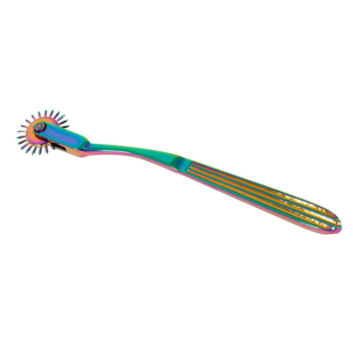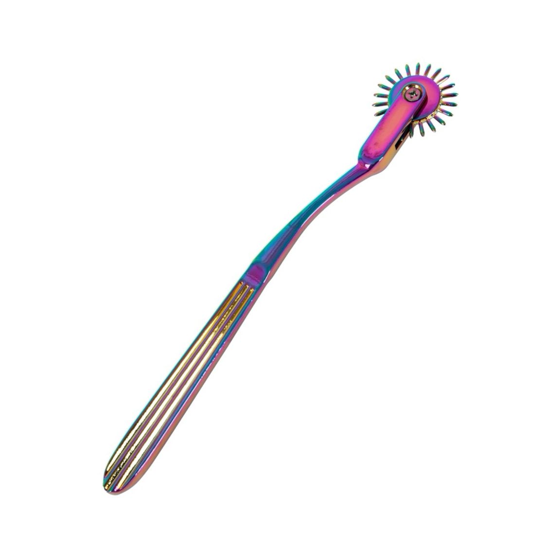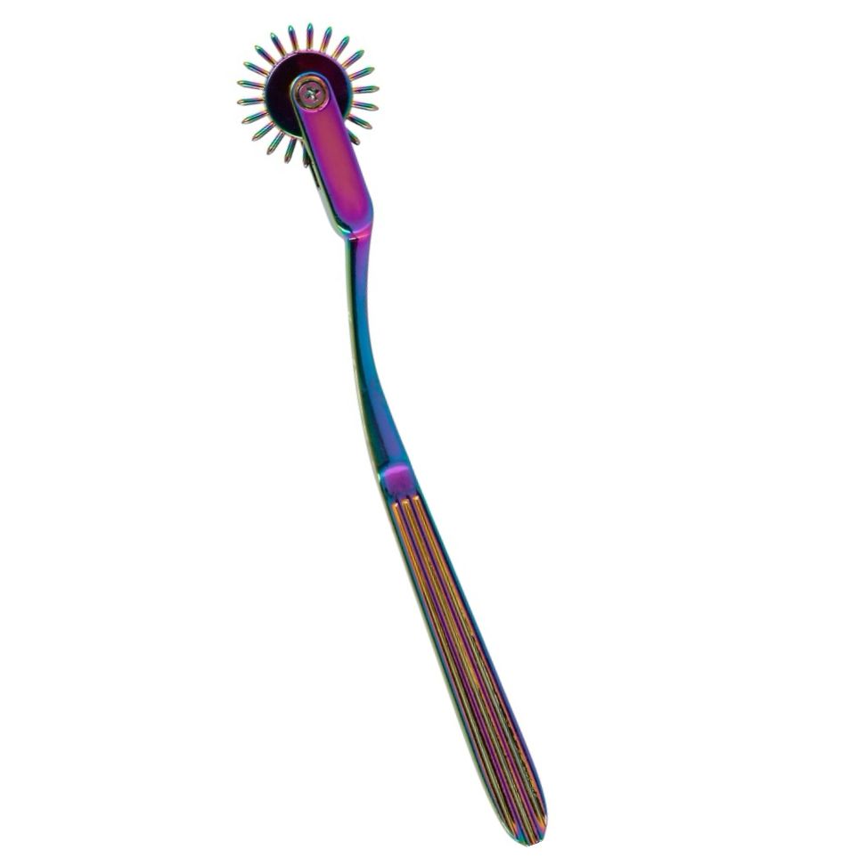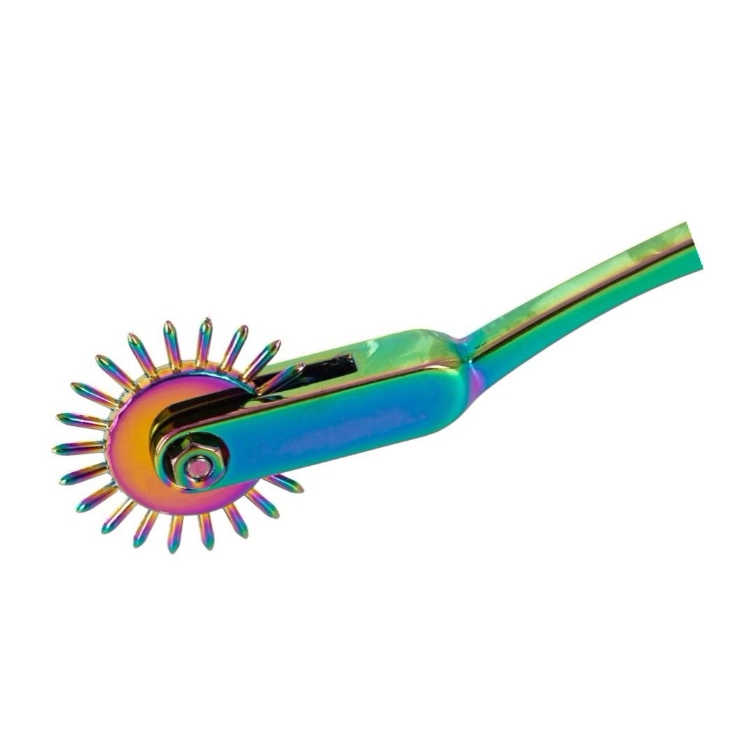 Roată Pinwheel Curcubeu din metal, realizată pentru control precis al intensităţii prin rulare pe piele. Roata este prevăzută cu ace fine şi ascuţite, care permit reglarea sensibilităţii de la atingeri delicate până la senzaţii mai intense.