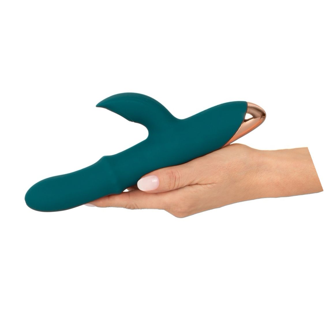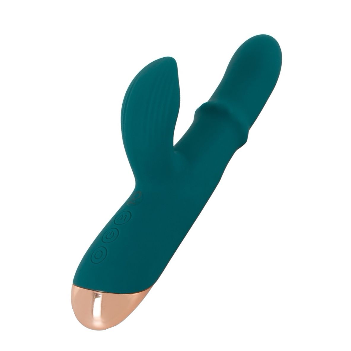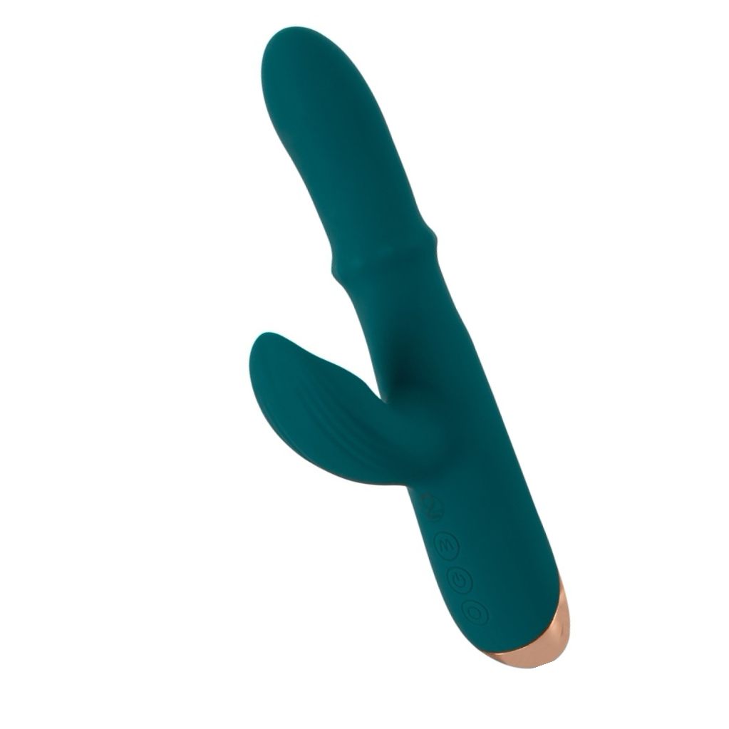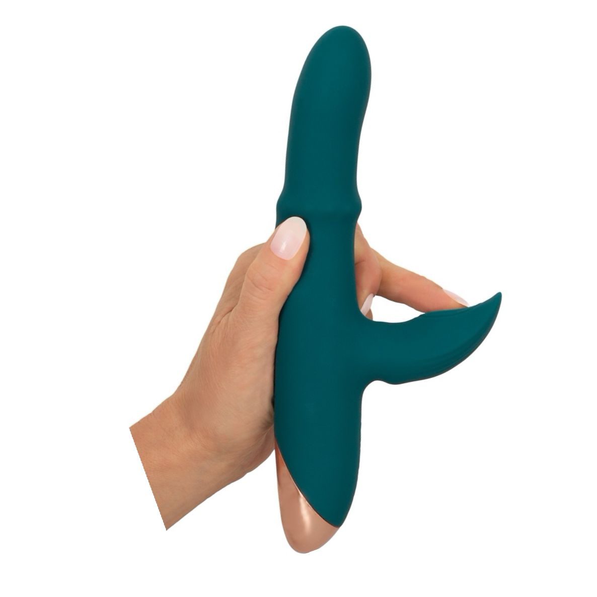 Vibratorul Rabbit Thumping de la You2Toys oferă stârnire dublă, precisă și reglabilă. Inelul mobil se mișcă sus-jos pentru frecție intern intens, iar brațul flexibil livrează pulsații dinamice la nivelul clitorisului. Toate funcțiile pot fi folosite separat sau combinate pentru variații rapide.