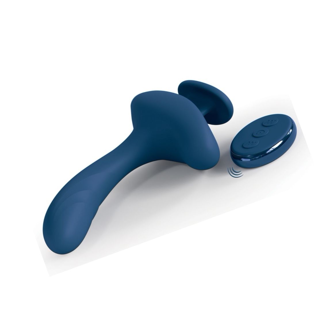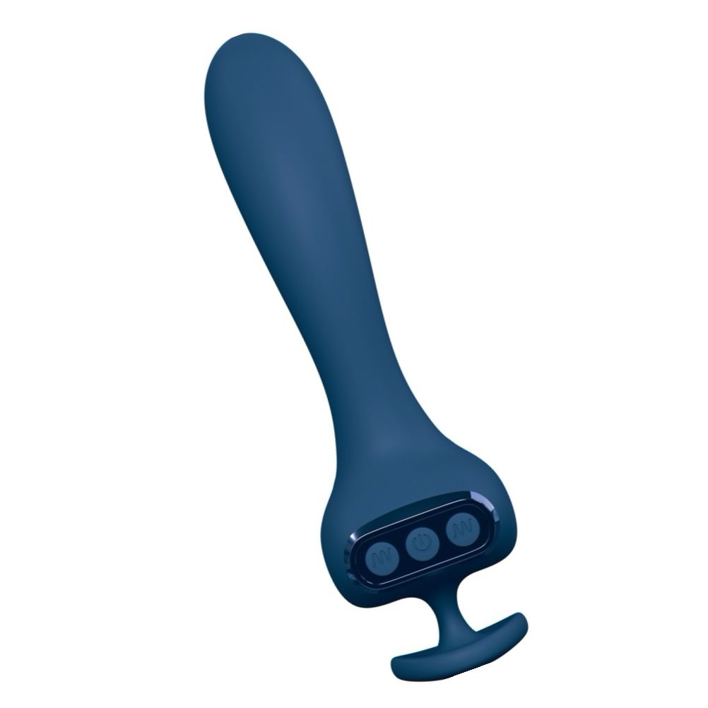 Vibrator anal Solis Kyrios de la JimmyJane: încălzire rapidă, 10 moduri de vibrație controlabile separat, telecomandă, mâner ergonomic cu două degete pentru inserare ușoară. Silicon catifelat, cu acumulator USB și rezistent la apă.