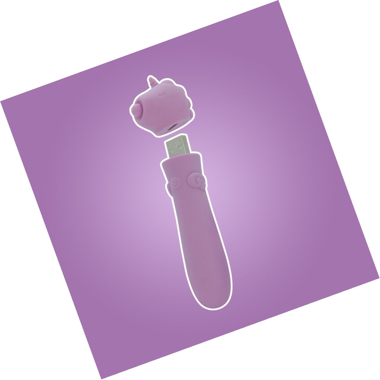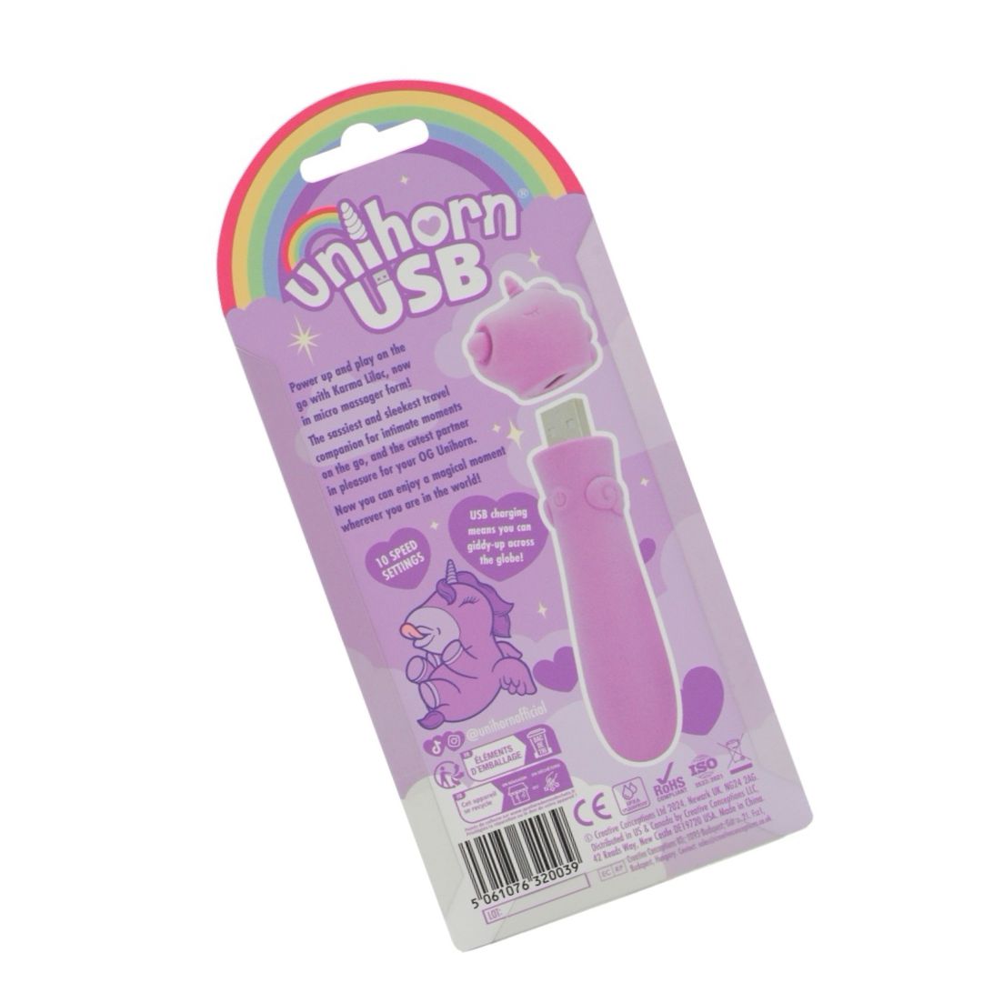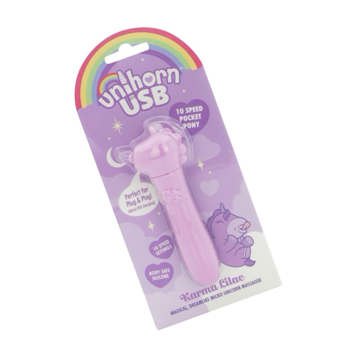Mini vibrator Unihorn Karma Lilac - design unicorn, 10 moduri de vibraţie, silicon mătăsos şi USB reîncărcabil. Mărime 14.3 cm. Viguros la apă, ideal pentru stimulare punctuală discretă.