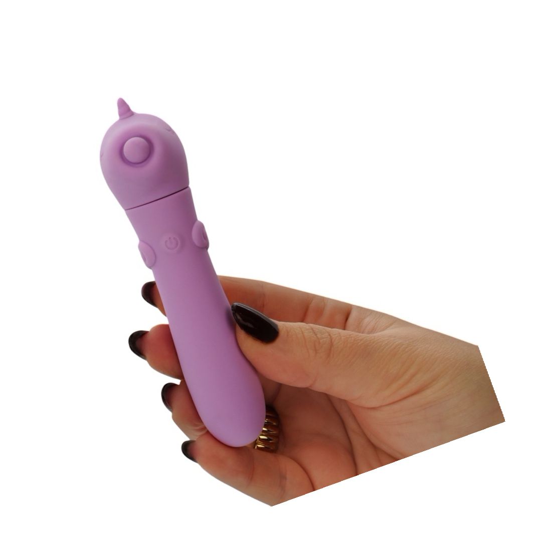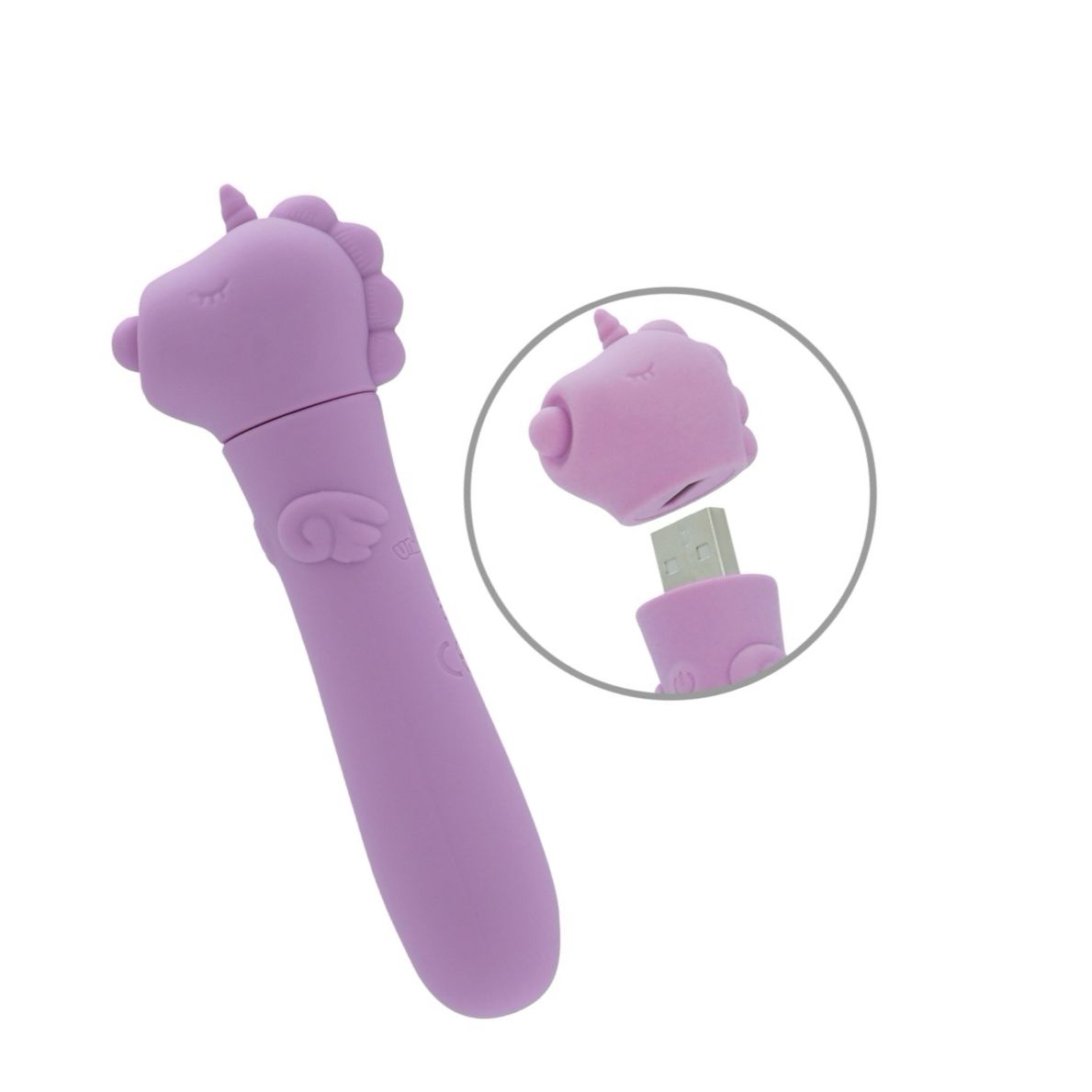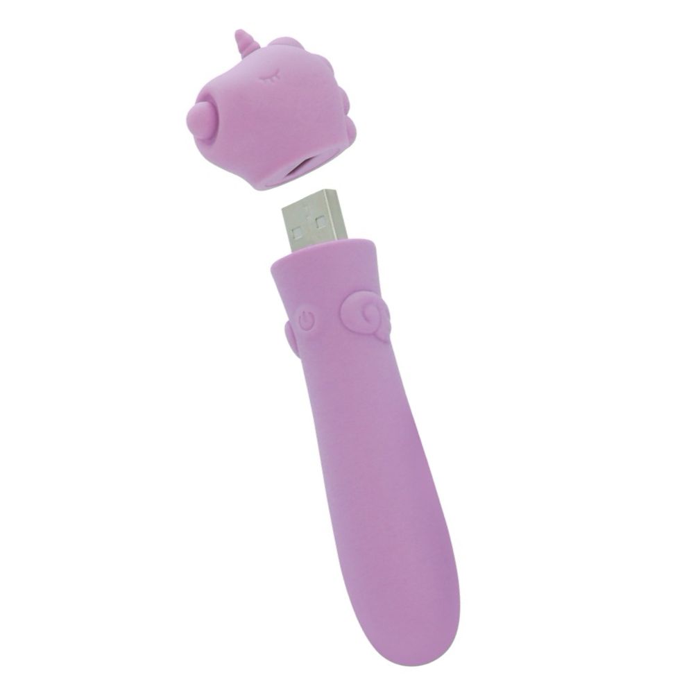 Mini vibrator Unihorn Karma Lilac - design unicorn, 10 moduri de vibraţie, silicon mătăsos şi USB reîncărcabil. Mărime 14.3 cm. Viguros la apă, ideal pentru stimulare punctuală discretă.