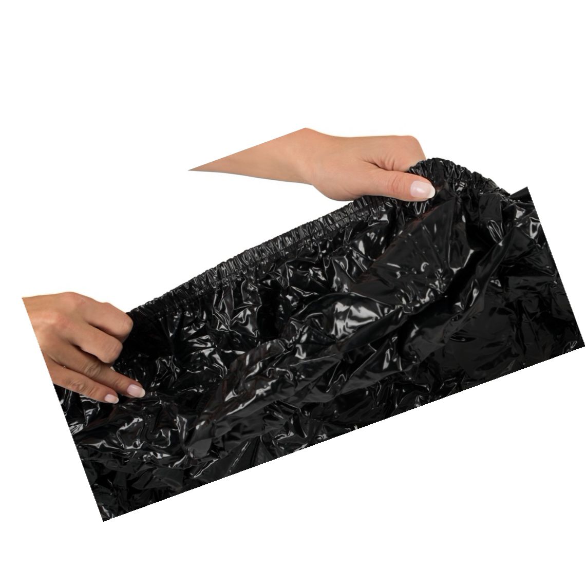 îmbrăcăminte de pat fitted din vinil lucios, negru, 2.20×2.20 m. Margini elastice şi cusătură extensibilă pentru prindere anti-alunecare. Curăţare uşoară cu lavetă umedă. Potrivită pentru saltele până la 2×2 m. Material durabil: PVC.