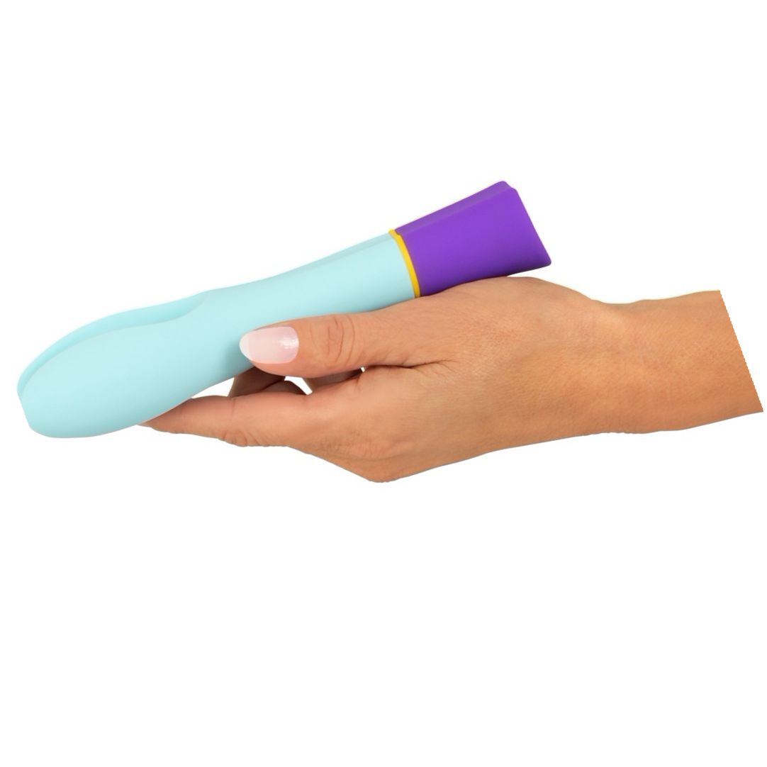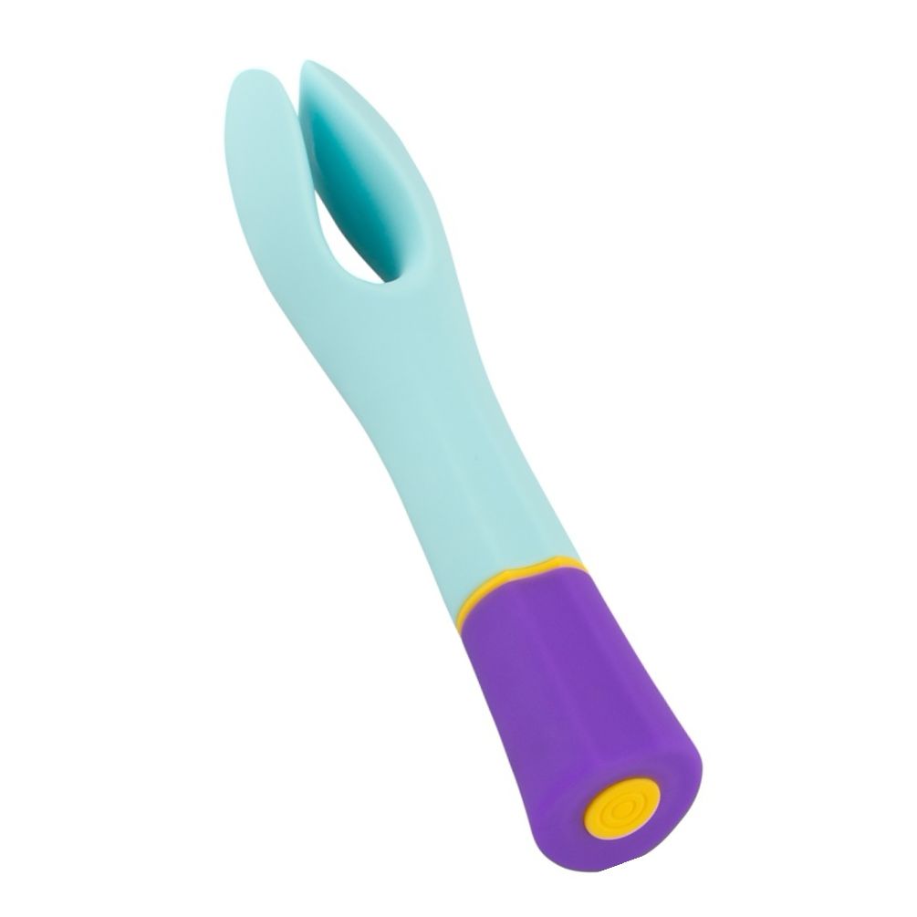 Vibrator dublu multicolor, reîncărcabil, cu 2 motoare și 10 moduri de vibrație. Textură soft-touch, rezistent la apă, ergonomic. Extindere totală 18.2 cm, inserabil 13.5 cm, greutate 100 g.