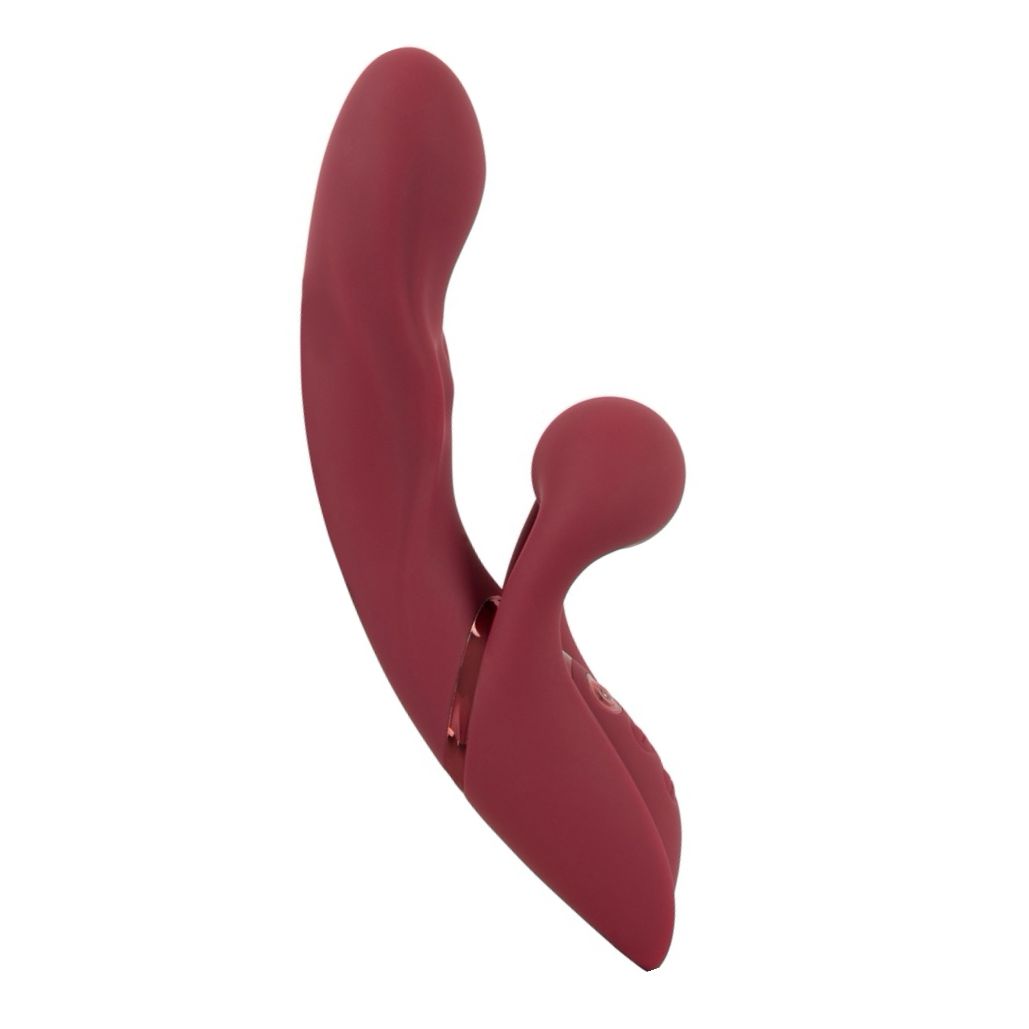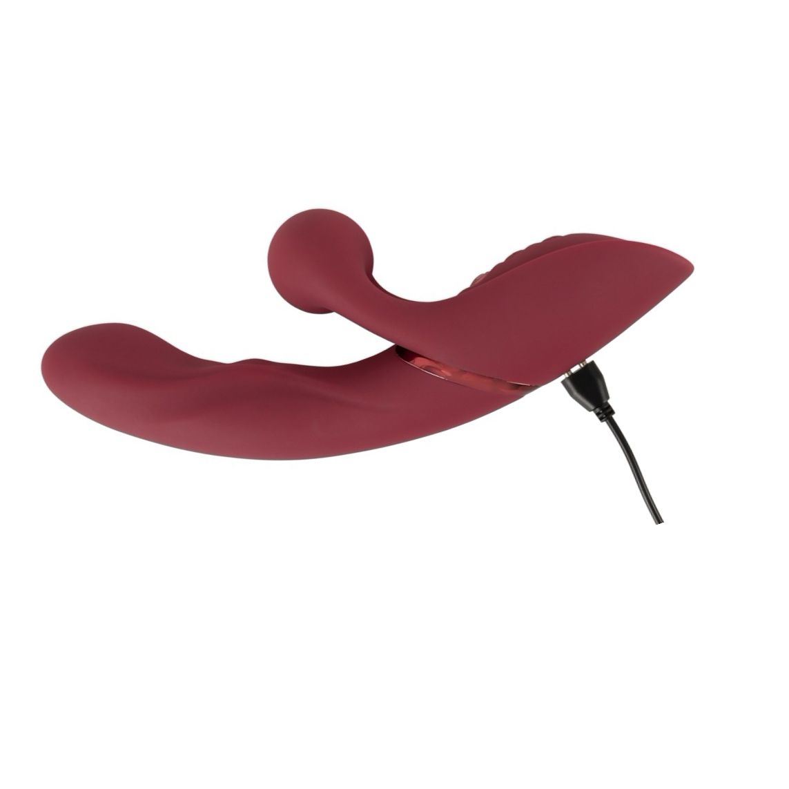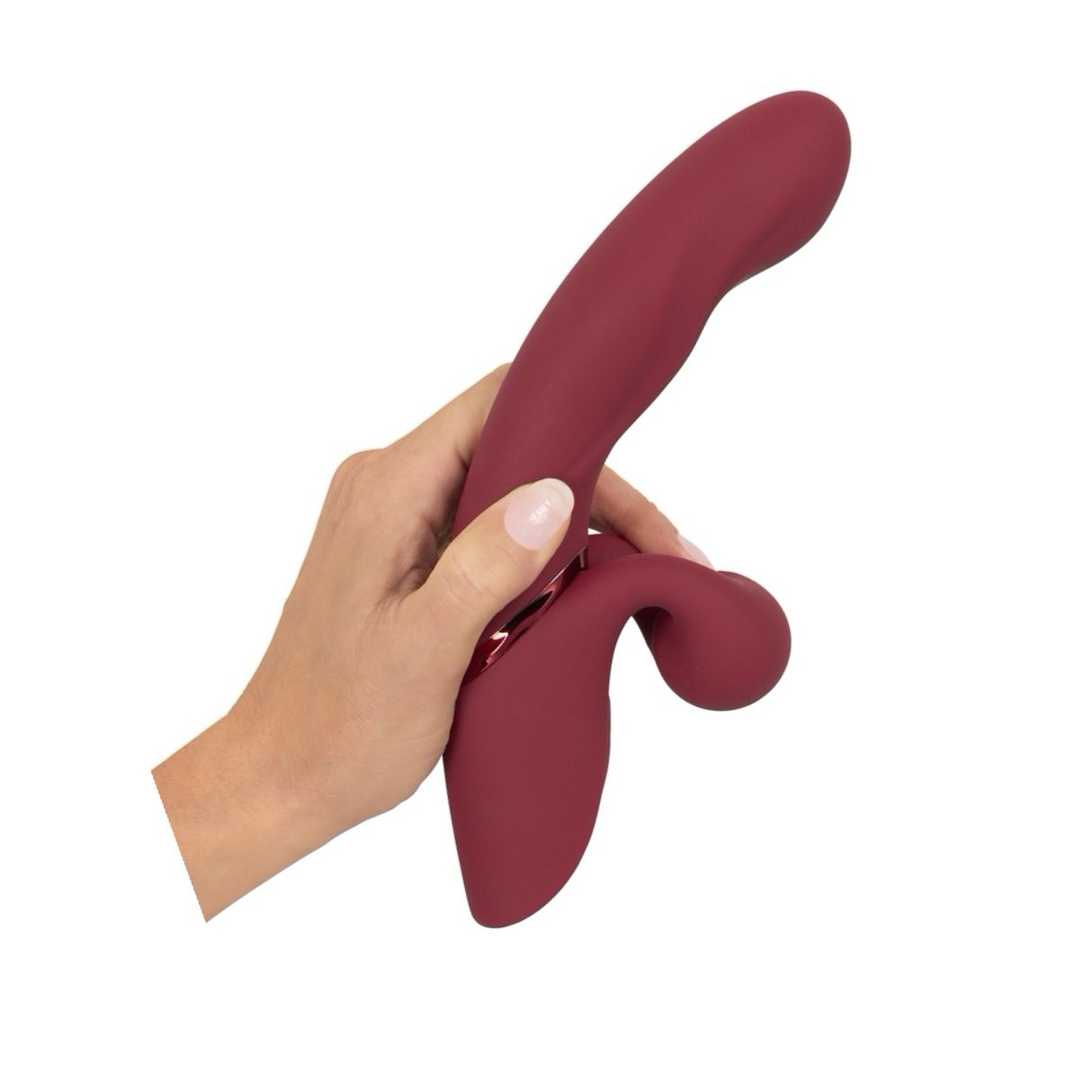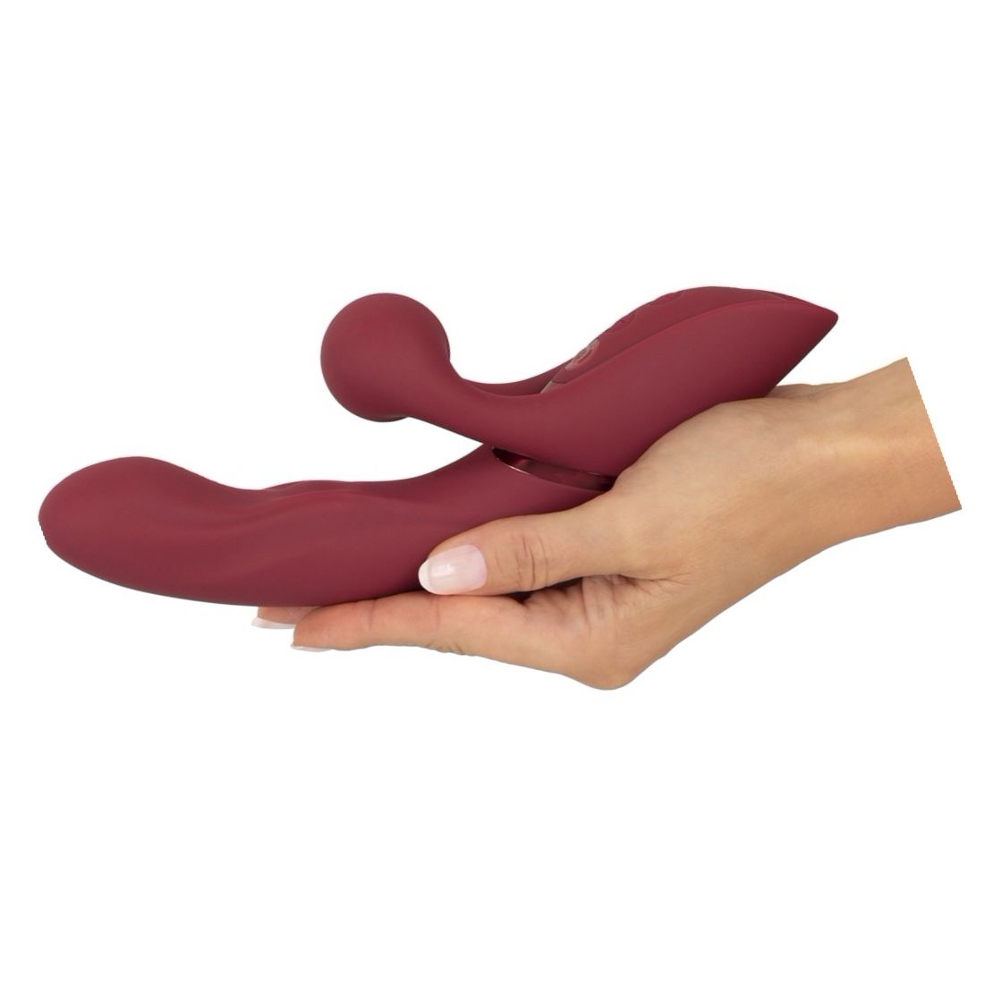 Pulsatorul rabbit JAVIDA 2-în-1 furnizează stimulare internă și externă printr-un design încovoiat cu vârf bombat și un stimulator clitoridian flexibil. Forma ergonomică și cele trei motoare compacte asigură funcționare puternică, dar discretă.