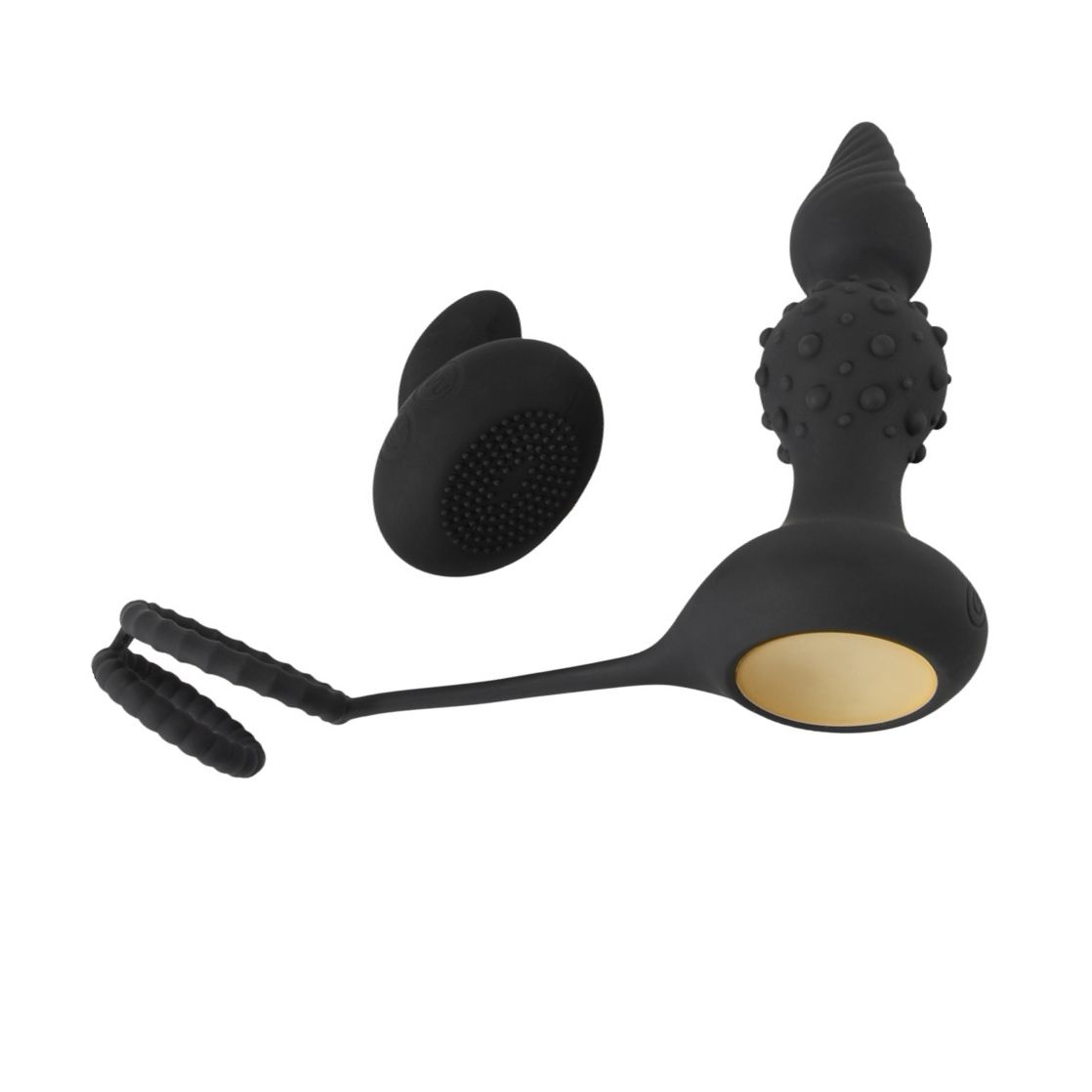 Set compact Rebel RC: dop anal stimulator cu inele flexibile pentru falus și scrot, control wireless până la 10 m și 10 maniere de vibrație. Reîncărcabil, material silicon/PU/ABS cu textură catifelată, pompă pentru fixare și funcționare discretă.