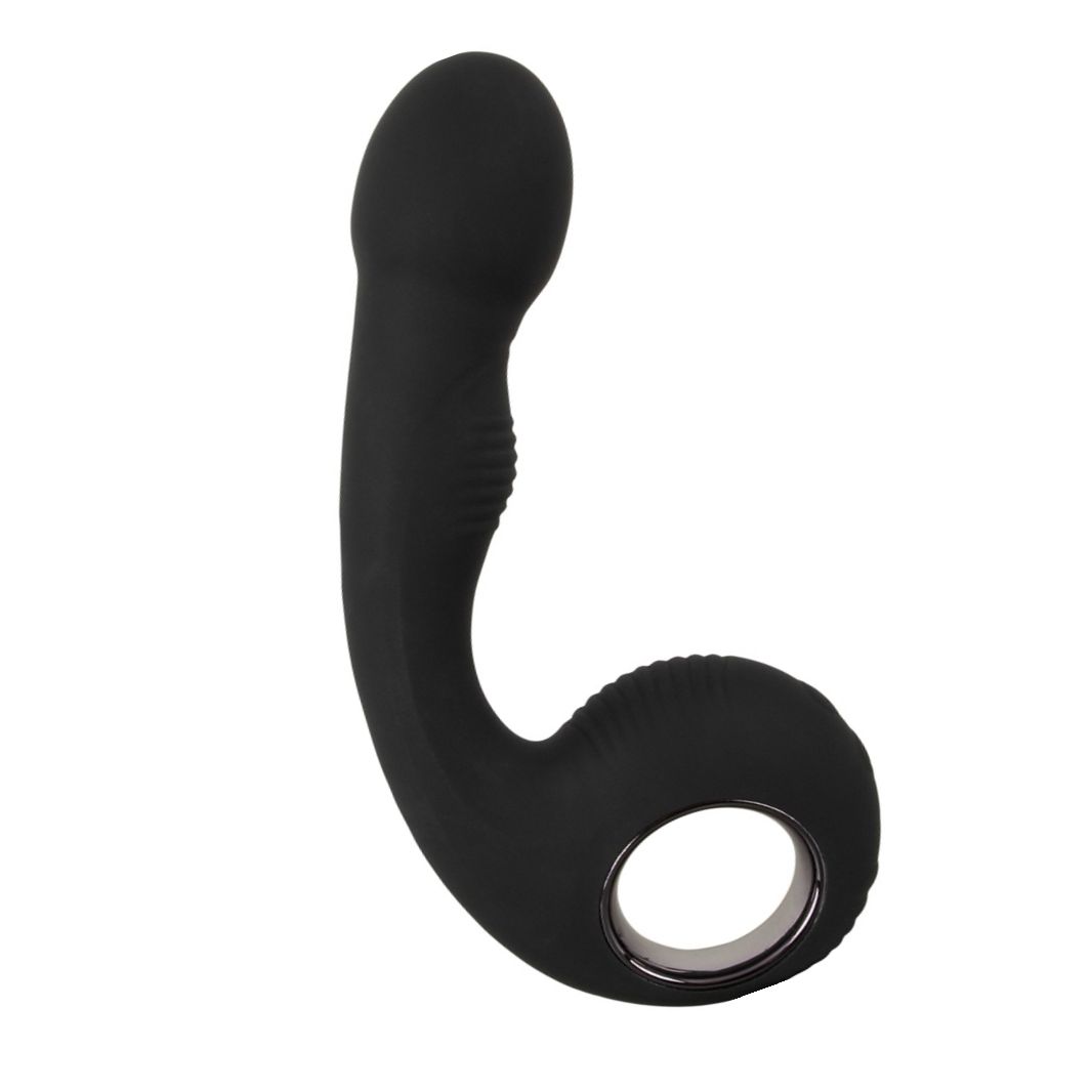 Stimulator Negru Velvets G P Spot, îndoit ergonomic pentru stimulare G/P. Două motoare silențioase cu 10 moduri controlabile independent, inel prindere anal-safe, silicon catifelat, reîncărcabil USB și rezistent la apă. Inserabil 11.5 cm.