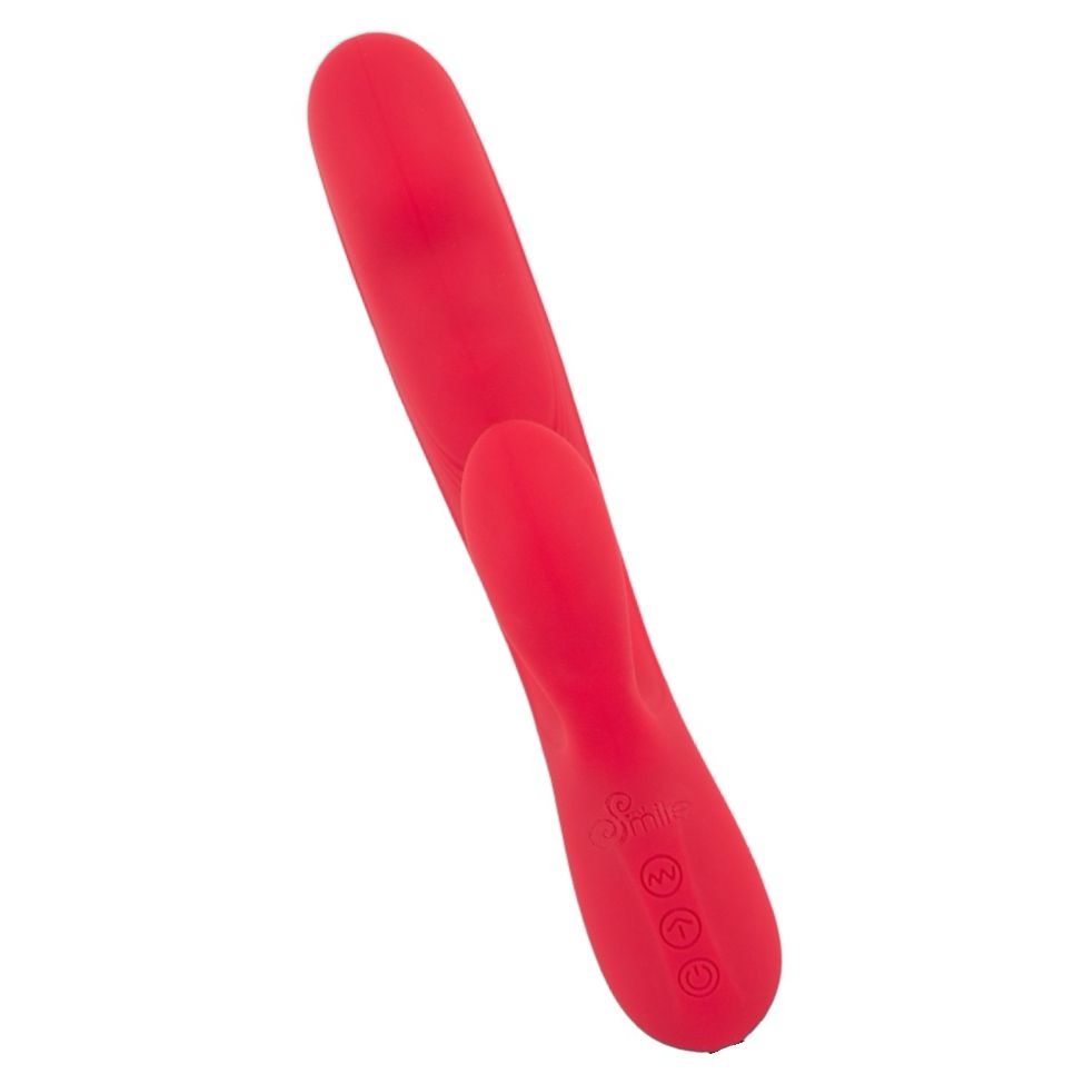 Stimulator dublu Sweet Smile: 3 motoare silențioase — cap și braț cu 10 chipuri de vibrație, ax cu 5 moduri de lovire. Silicon catifelat, flexibil, cu acumulator USB și zdravăn la apă. Mărime necondiționată 21.2 cm.