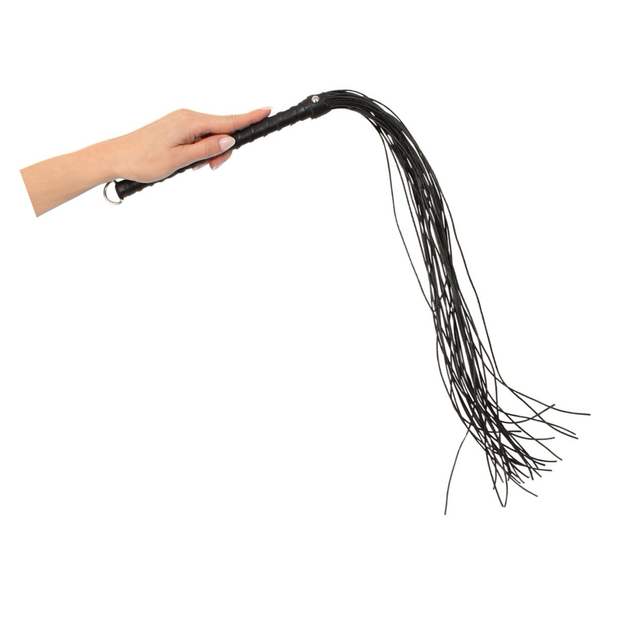 Flogger ZADO din epidermă naturală, 70 cm. Curele rotunde subțiri cu vârfuri ascuțite, ansamblu de prindere îmbrăcat și inel pentru agățare. Propus pentru plesnire ușoară și control precis.