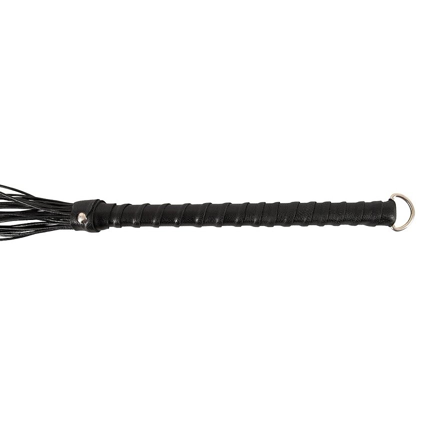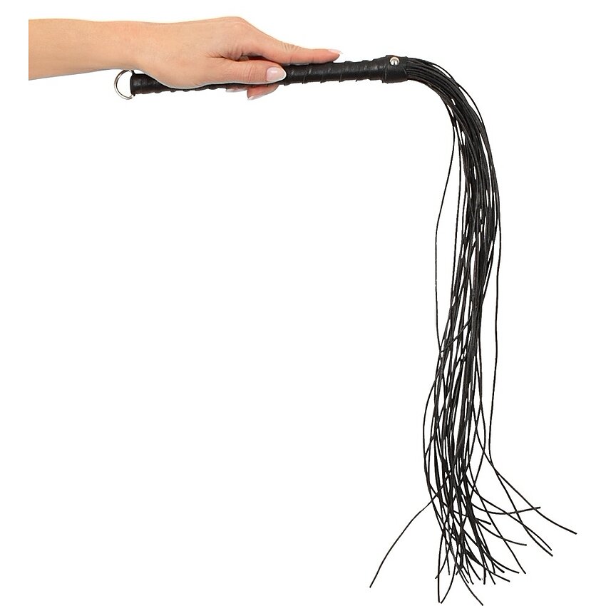 Flogger ZADO din piele naturală, 70 cm. Curele rotunde subțiri cu vârfuri ascuțite, ansamblu de prindere îmbrăcat și inel pentru agățare. Propus pentru plesnire lejeră și control precis.