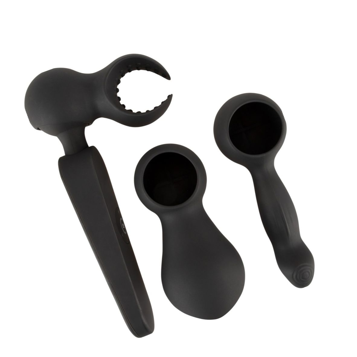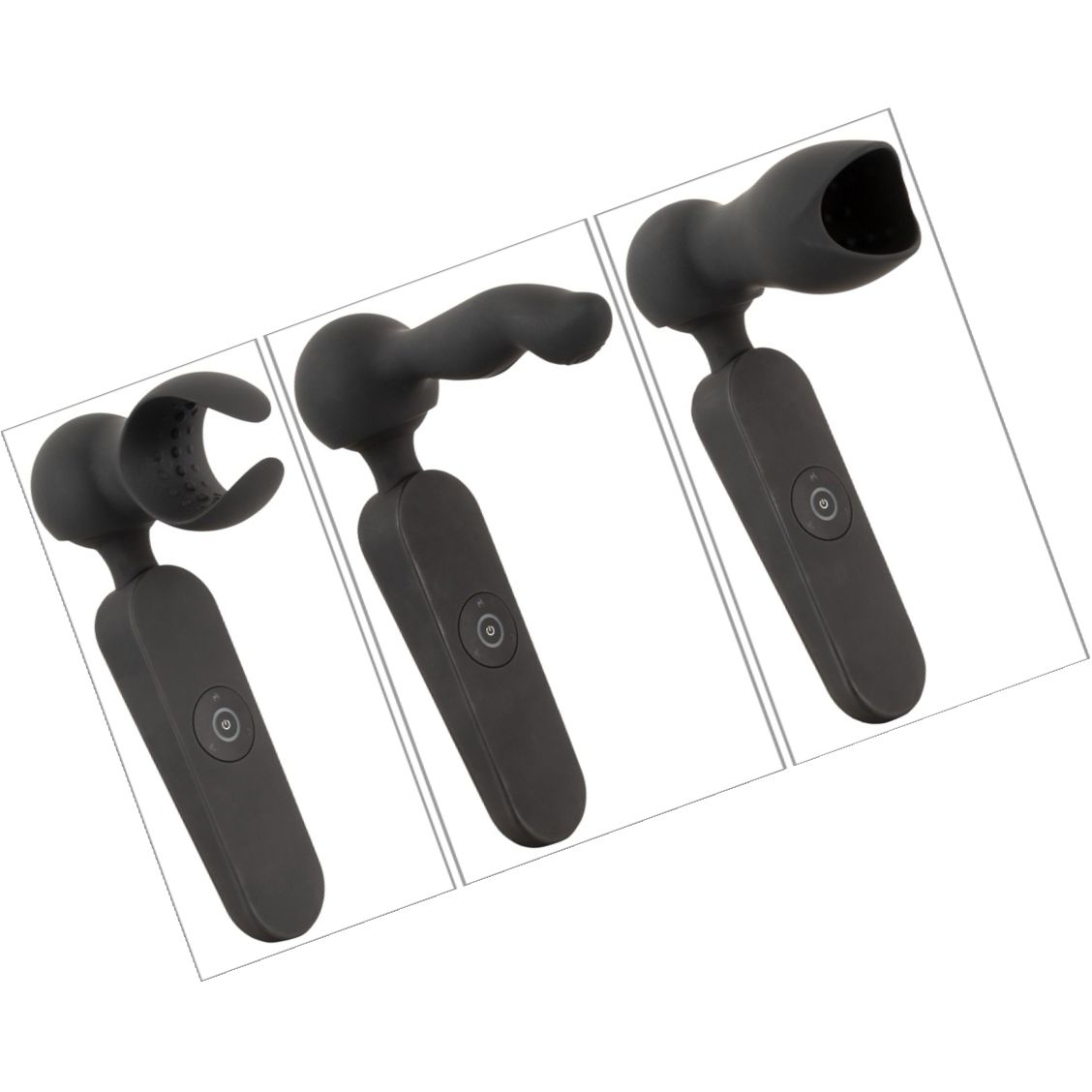 Setul conține trei podoabe moi interschimbabile: penis virtual texturat (16 cm total, inserabil 10,5 cm, calibru max. 2,8 cm), masturbator închis cu texturi (13,5 cm, adâncime inserabilă 8,5 cm) și masturbator deschis flexibil (11,5 cm, diametru 3,8 cm). Accesoriile se montează ușor și sunt gândite pentru frecție extern și utilizare intimă.