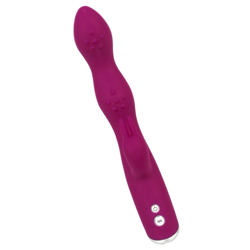 Vibrator Sweet Smile Rabbit: 3 motoare independente și 7 moduri pentru stimulare A (AFE) și G, plus stimulator clitoridian. Shaft maleabil cu capete texturate, silicon moale. Lungime 23.6 cm (inserabil 15 cm). Funcționează cu 2 x AAA (nu sunt incluse).
