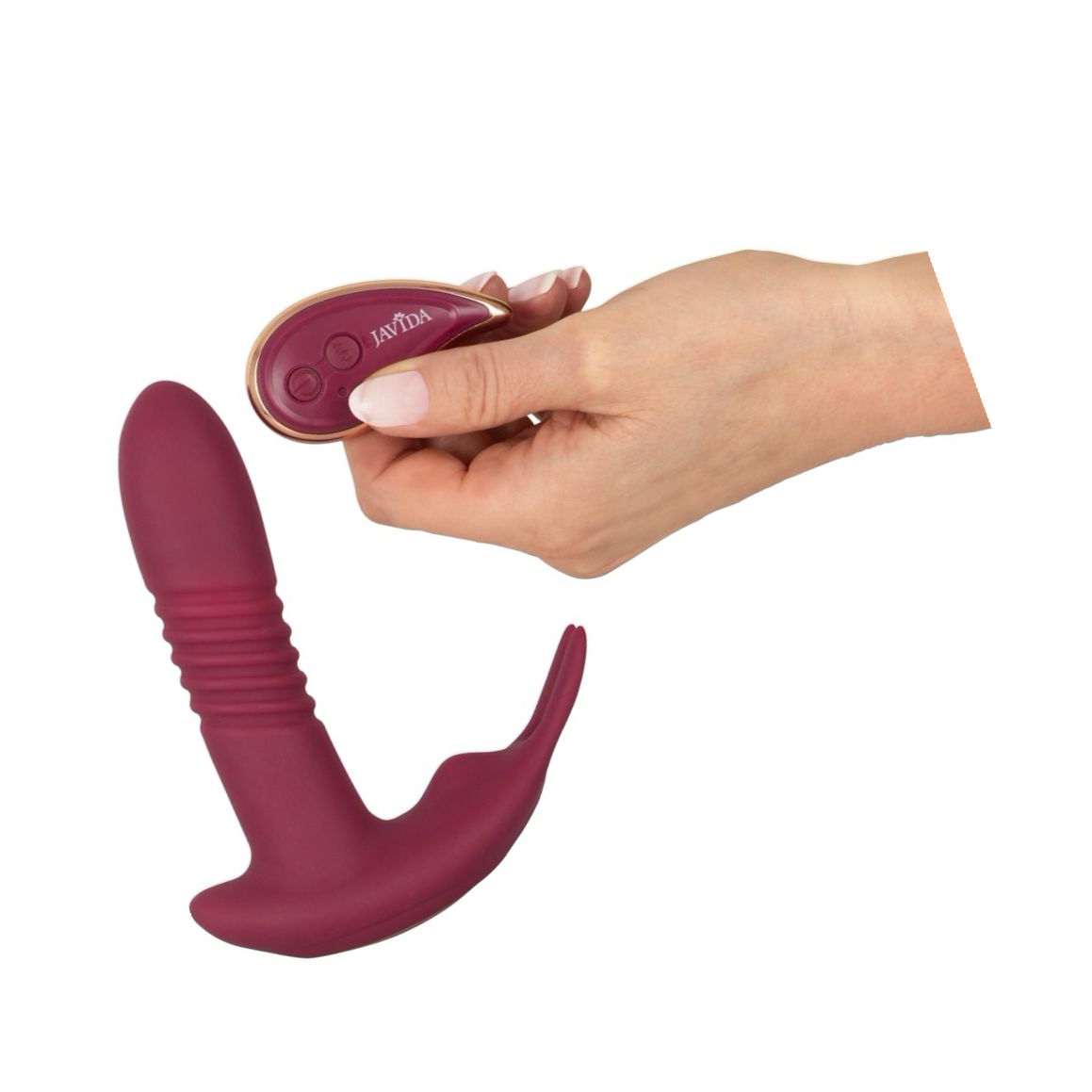 JAVIDA RC Hands-free 3în1: mecanism hands-free cu acumulator cu deplasare de împingere, perle rotative și stimulator clitoridian. 10 viteze perle + 10 moduri vibrație, telecomandă (5 m), motor silențios.