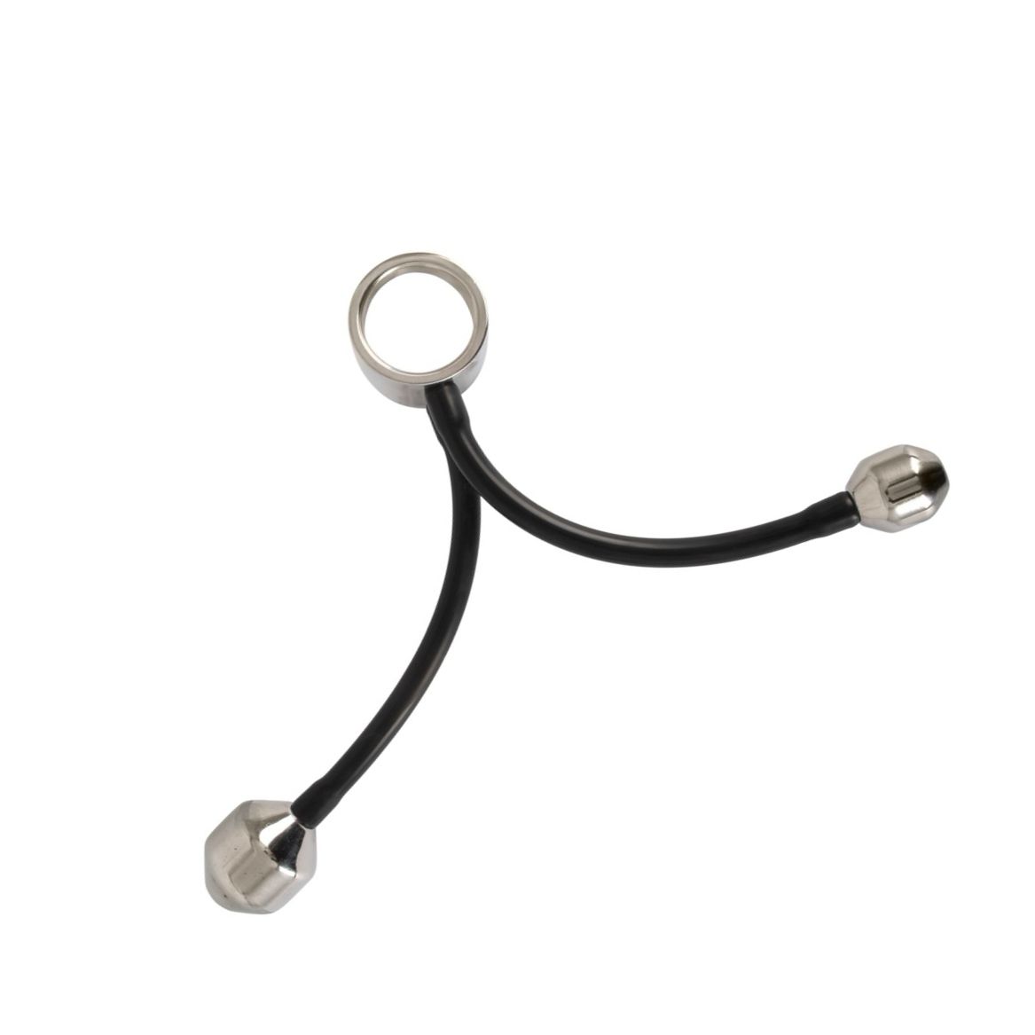 Set robust pentru stârnire anală și susținere peniană: inel metalic neted (0,6 cm grosime) cu două pluguri alipite prin cingătoare flexibile din silicon. Lungime totală 31 cm; pluguri 3,7/5,1 cm; greutate 840 g.