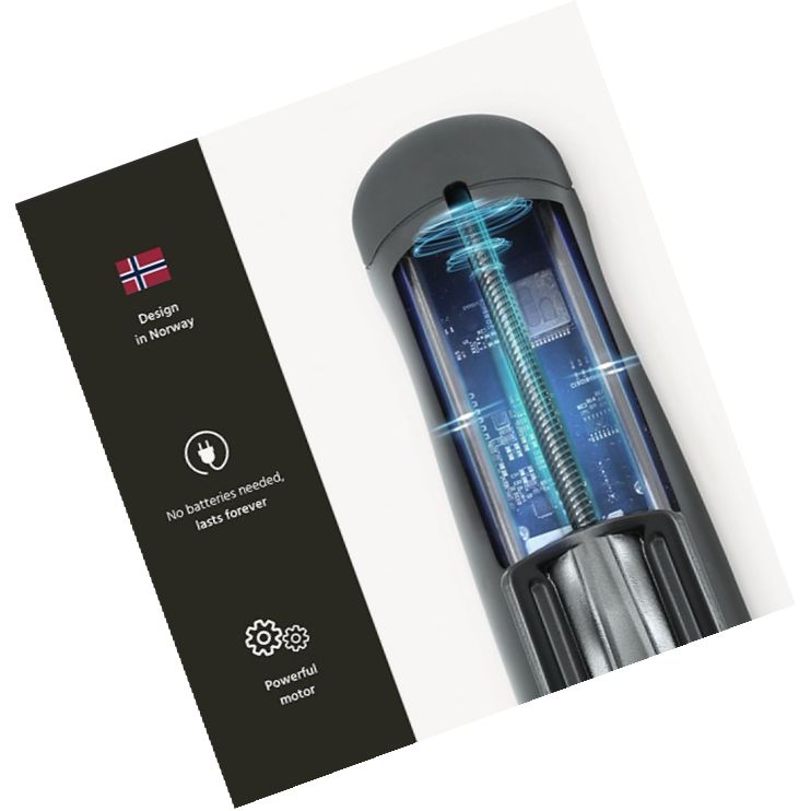 Manșonul TrueGrip, cu capăt închis, se fixează rapid și se curăță ușor: clătiți și întoarceți pe dos. Dispozitivul este alimentat la rețea și include adaptor unghi 90° pentru o instalare simplă.
