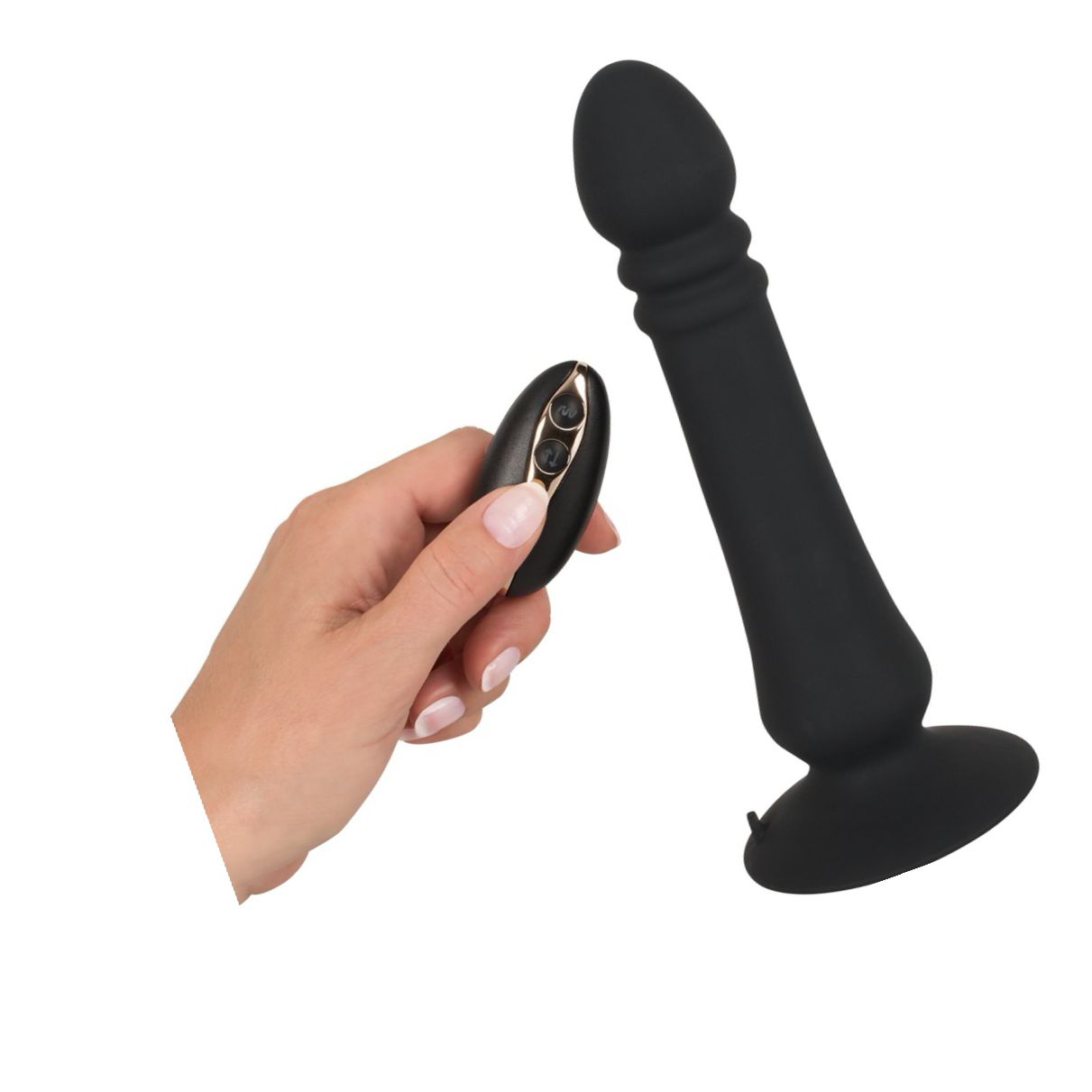 Stimulator anal cu acumulator Negru Velvets, cu cap rotund, 7 moduri de vibrație și 3 viteze de impuls. Pompă puternică, telecomandă inclusă și rezistent la apă. Siliciu sanitar și ABS, lungime inserabilă 18 cm.