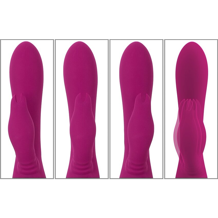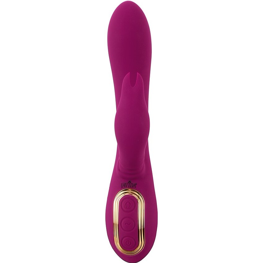Vibrator reîncărcabil JAVIDA cu perle rotative şi stimulator pentru clitoris mobil: 10 moduri de vibraţie, 5 viteze de rotaţie, 3 motoare, silicon catifelat şi rezistenţă la apă. Control intuitiv, compact şi discret.