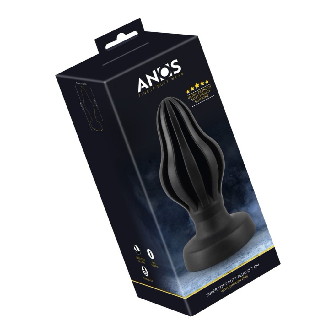 Plug anal ANOS Super Soft O 7 cm, din silicon lichid non-poros, cu regiune extra-moale și caneluri pentru inserție facilă. Bază largă cu ventuză pentru fixare sigură și utilizare hands-free. Simplu de curățat.