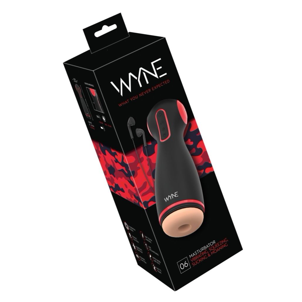 Masturbator WYNE Dual‑Motor: 10 maniere vibrație, 7 feluri aspirație, presiune dublă în 7 trepte, manson Soft Touch detașabil, difuzor și căști incluse, cu acumulator USB și capac protector pentru depozitare discretă.